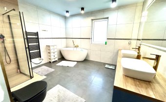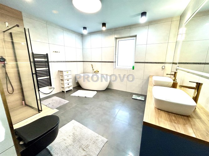 Na powierzchnię użytkową składa się przestronny salon połączony z aneksem kuchennym i wyjściem na taras i do ogrodu, spiżarnia, pomieszczenie gospodarcze, sypiania główna z garderobą dodatkowo 3 pokoje z czego jeden z prywatną łazienką i sauną, oraz przestronna łazienka z wanną i natryskiem.
