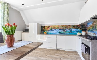 • na pierwszym poziomie: 2 pokoje, kuchnia z wyjściem na taras, łazienka z prysznicem, pomieszczenie gospodarcze