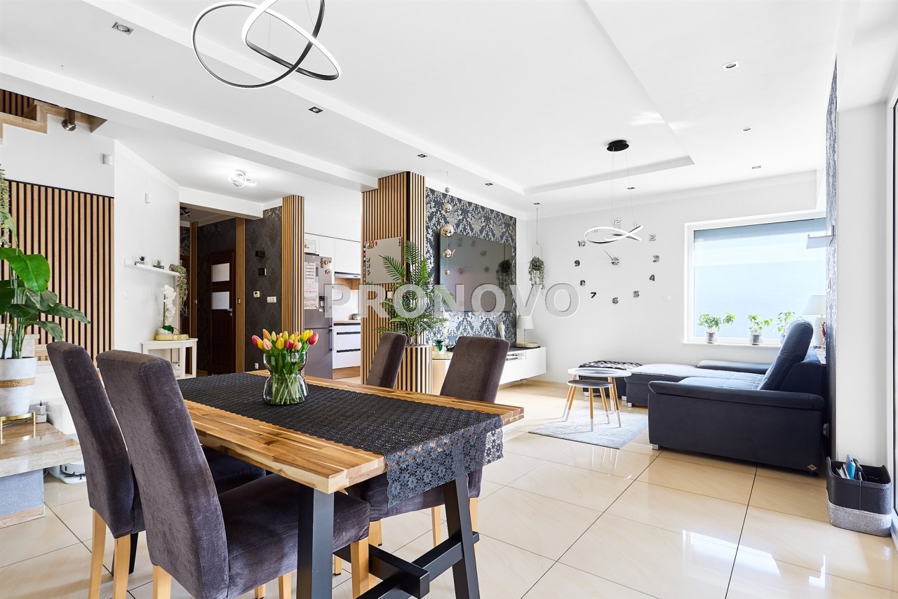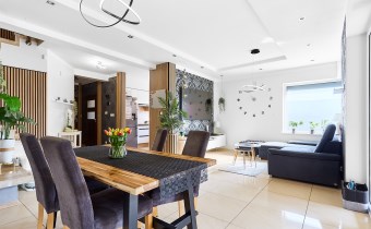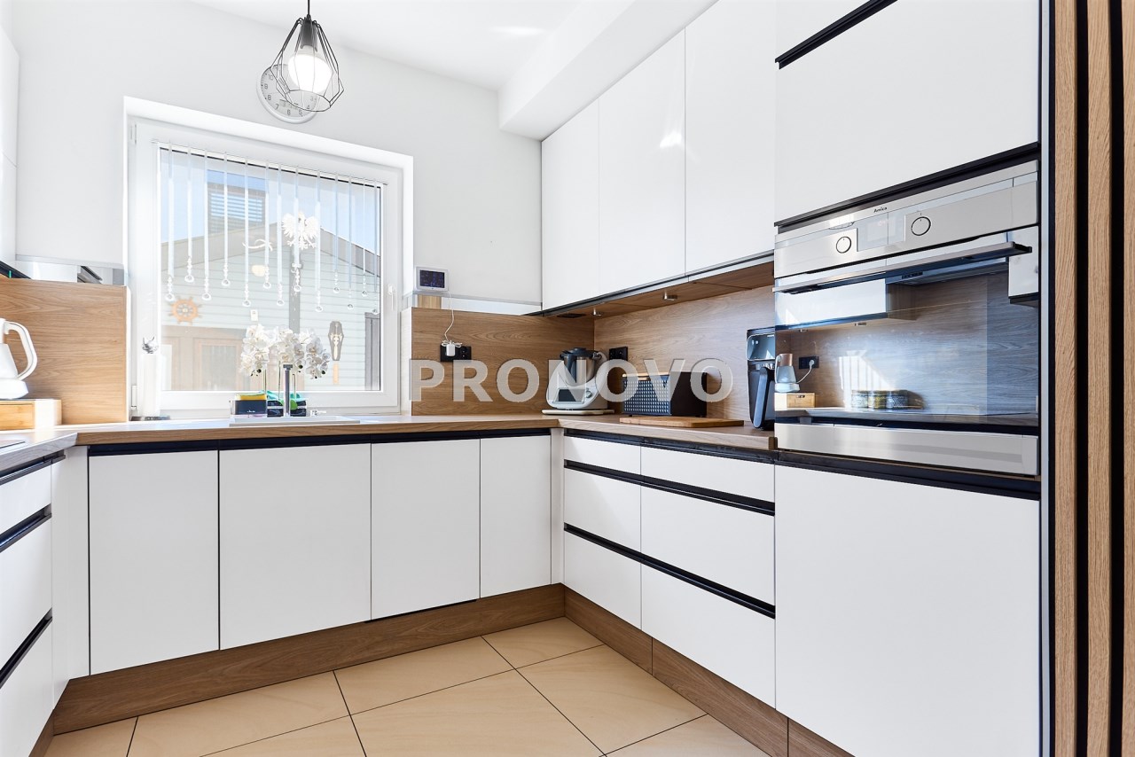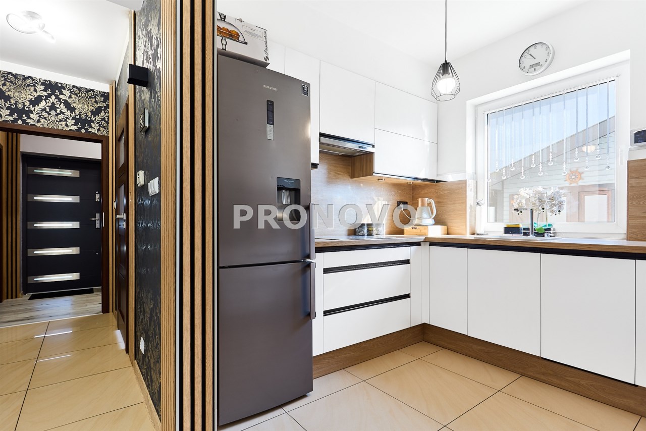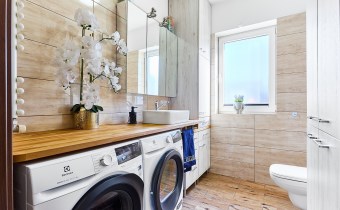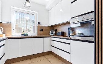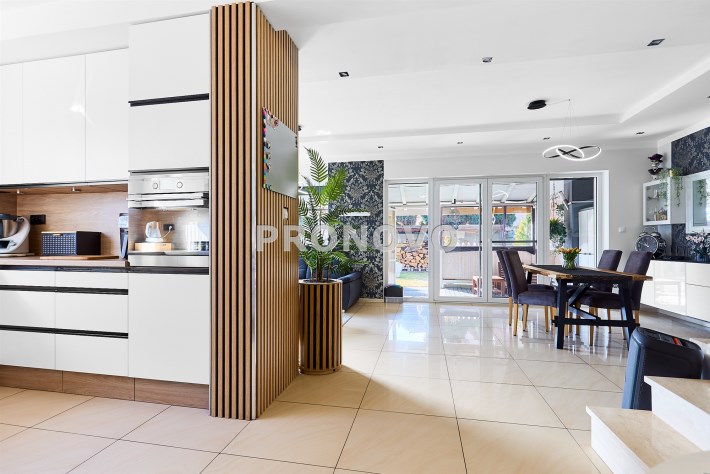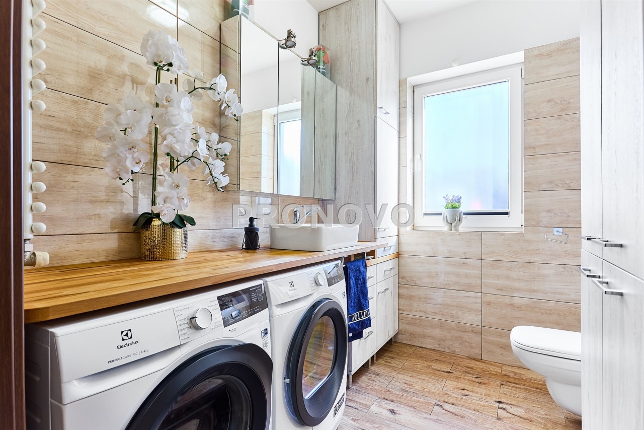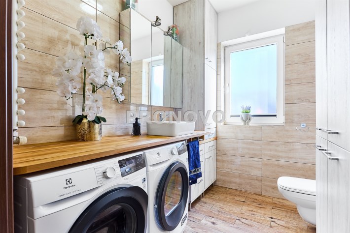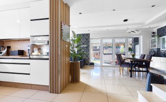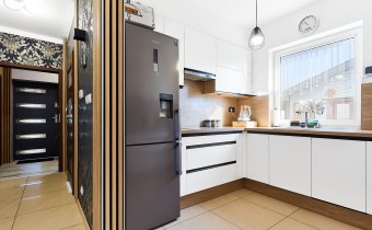 Na PARTERZE wiatrołap prowadzi do przedsionka z dużą, wygodną szafą na odzież wierzchnią. Dalej znajduje się serce domu – przestronny salon o powierzchni około 28 m² z kominkiem. oraz wyjściem na zadaszony taras i ogród. Kuchnia jest oddzielna, w pełni wyposażona w zabudowę z nowymi, lakierowanymi frontami oraz nowym sprzętem AGD. Na tej kondygnacji znajduje się również WC z miejscem na pralkę i suszarkę.