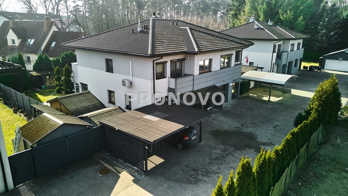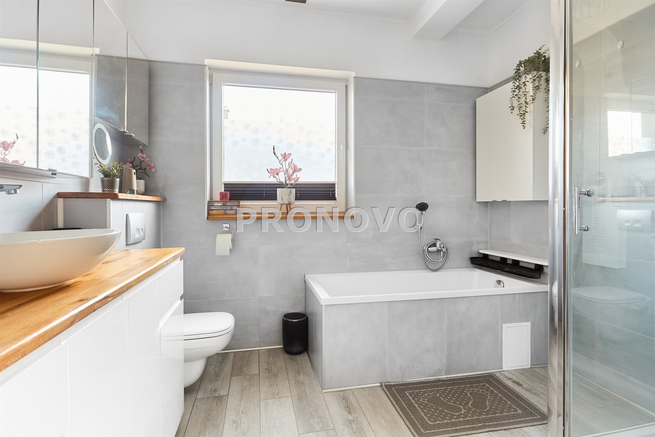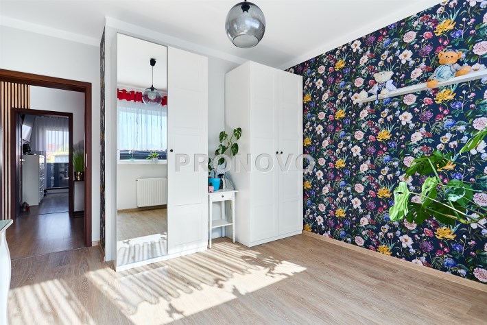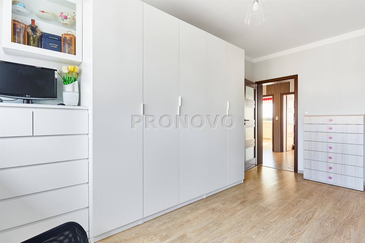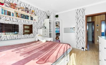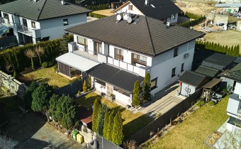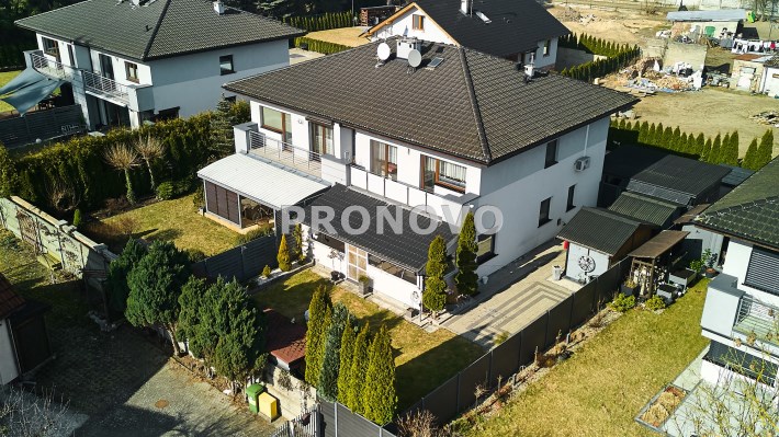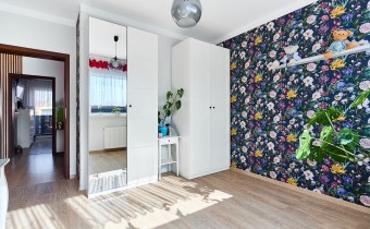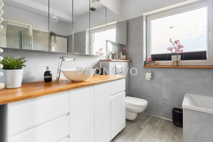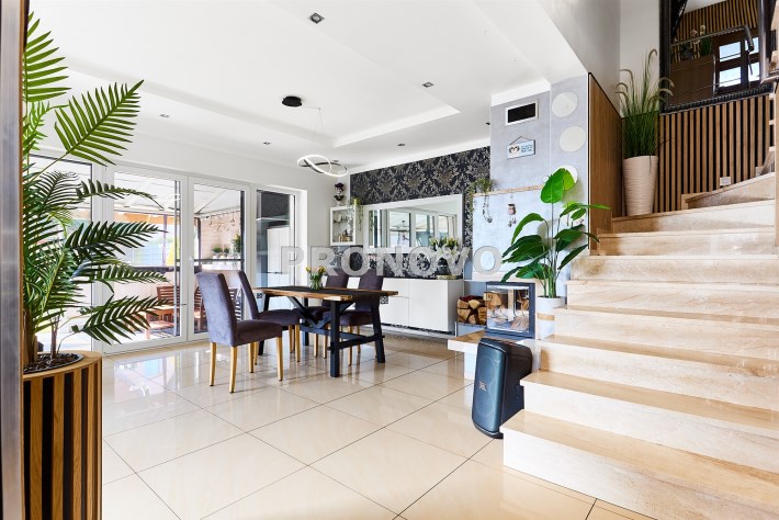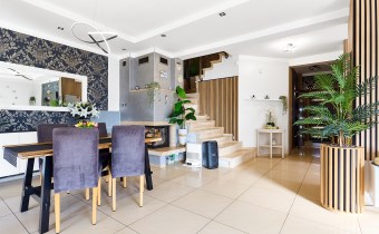 Na PIĘTRZE znajdują się cztery sypialnie – każda z własnym balkonem oraz przestronna łazienka wyposażona w wannę i prysznic. Wnętrza wykończono z dbałością o detale – marmurowe schody i parapety, solidne tynki, eleganckie tapety oraz wysokiej klasy panele podłogowe.