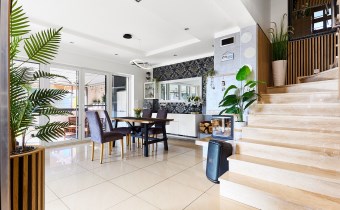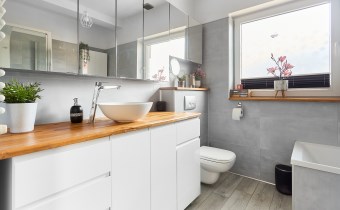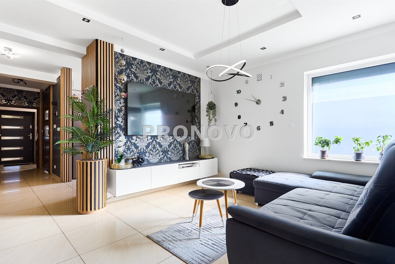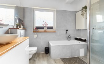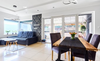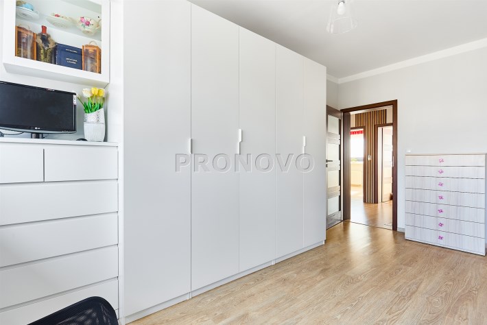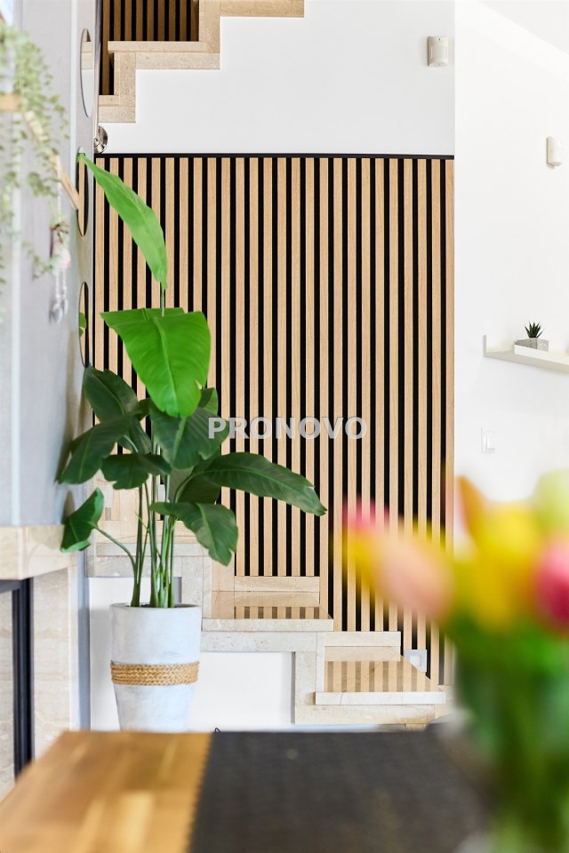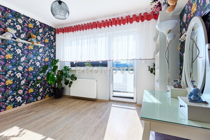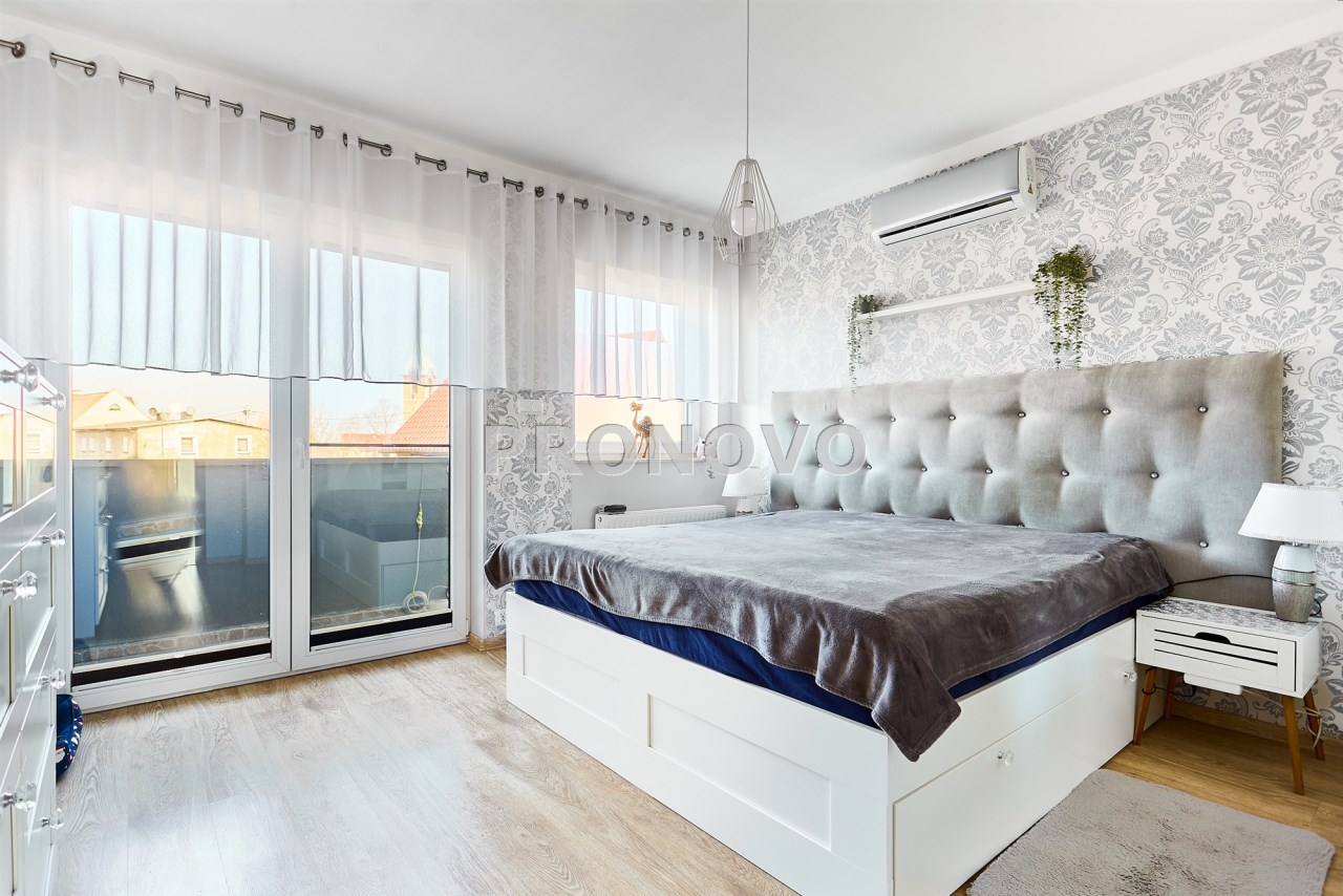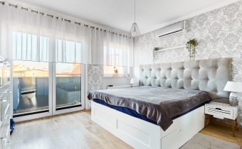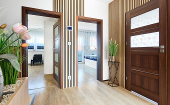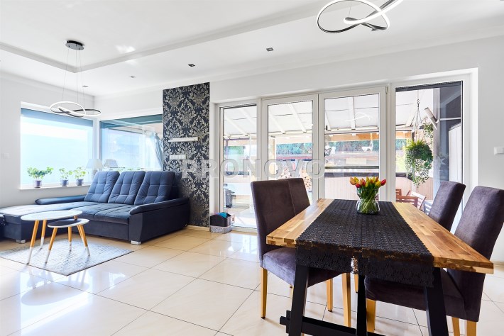 Na PIĘTRZE znajdują się cztery sypialnie – każda z własnym balkonem oraz przestronna łazienka wyposażona w wannę i prysznic. Wnętrza wykończono z dbałością o detale – marmurowe schody i parapety, solidne tynki, eleganckie tapety oraz wysokiej klasy panele podłogowe.
