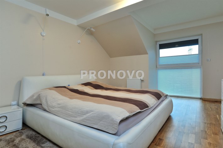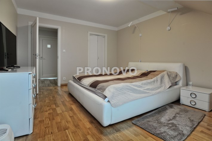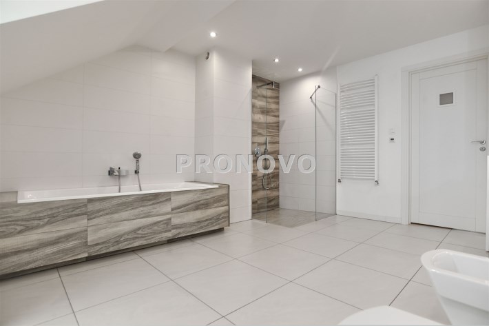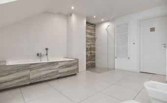 Piętro: trzy komfortowe sypialnie (jedna z garderobą), elegancka łazienka z wanną, prysznicem, bidetem i podwójną umywalką, wyjście na balkon z łazienki i sypialni.