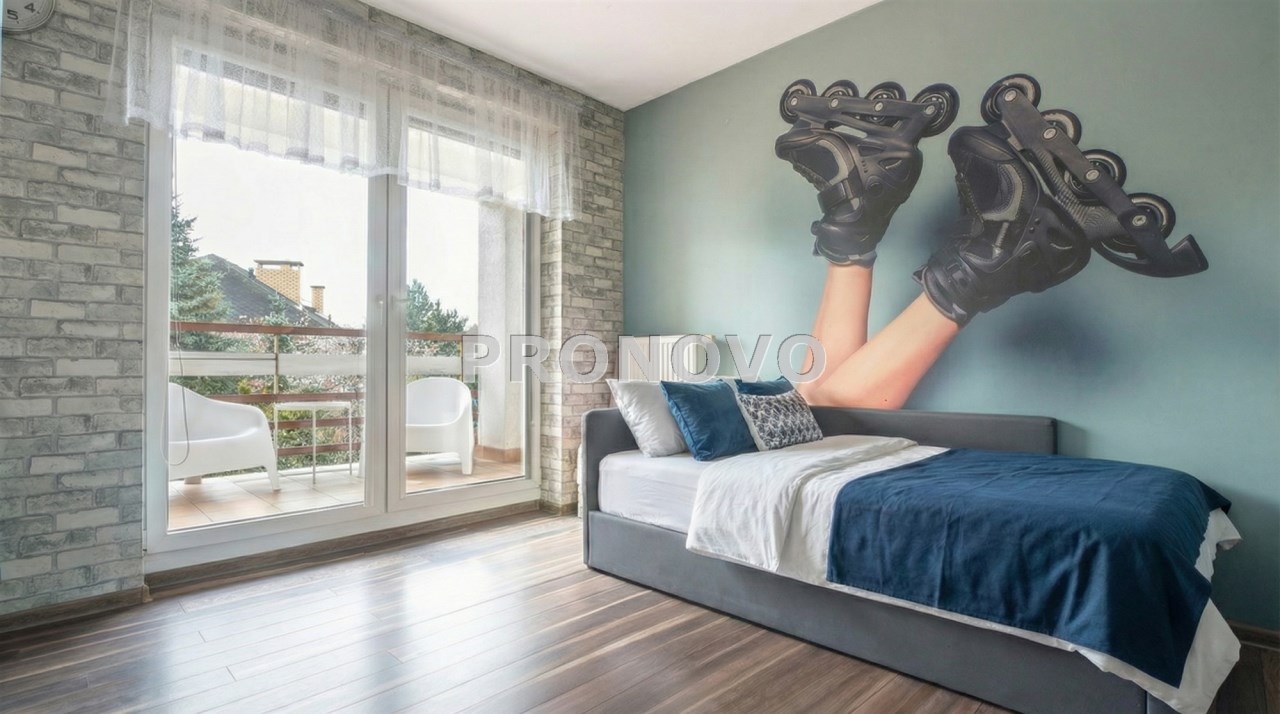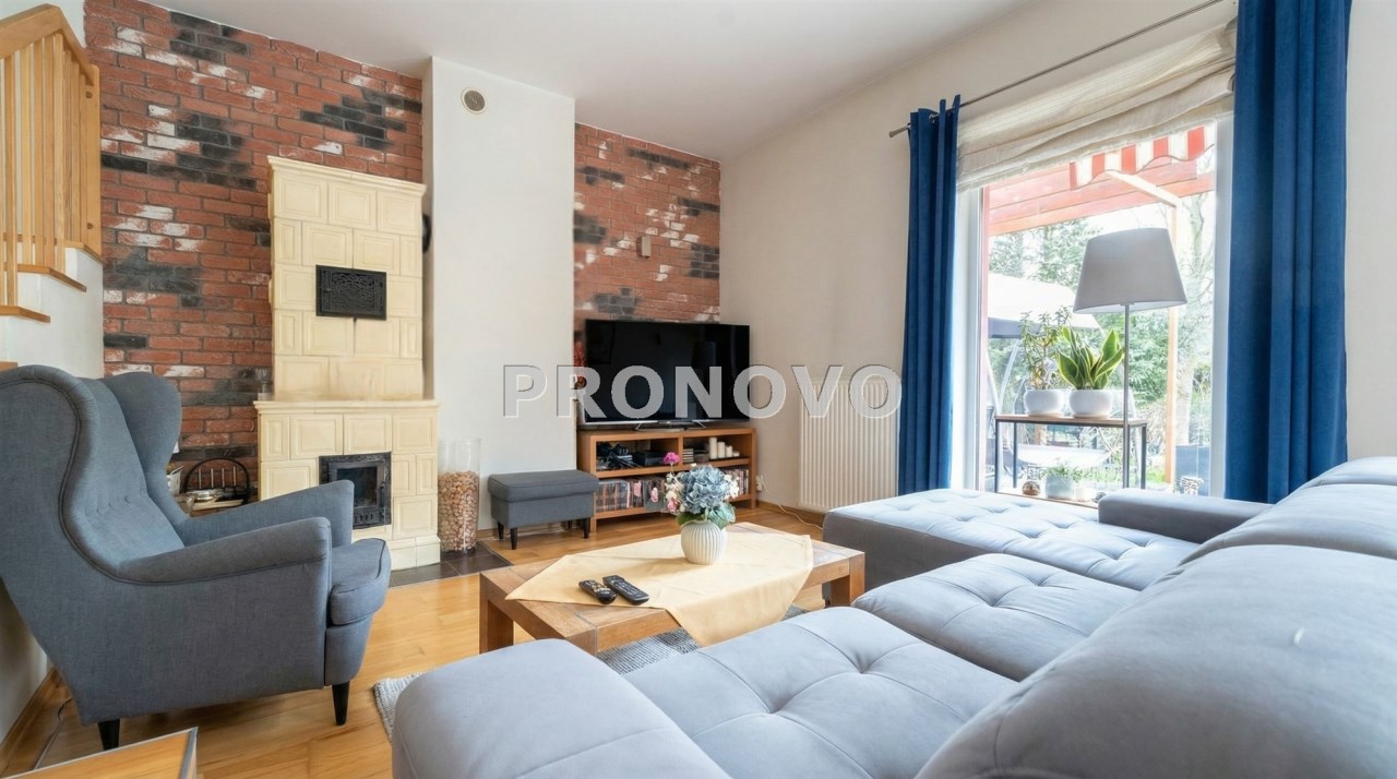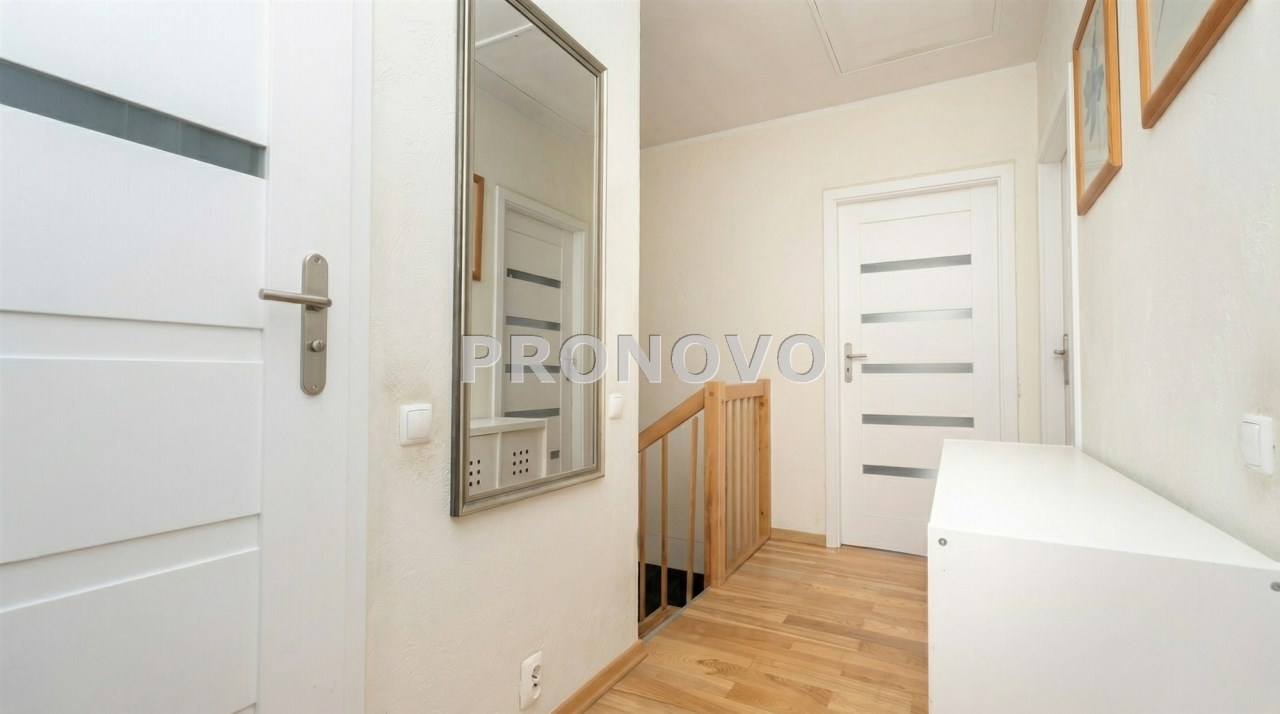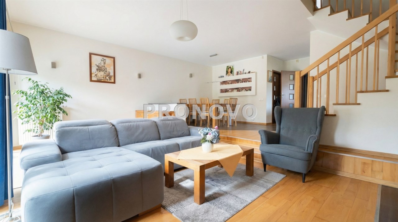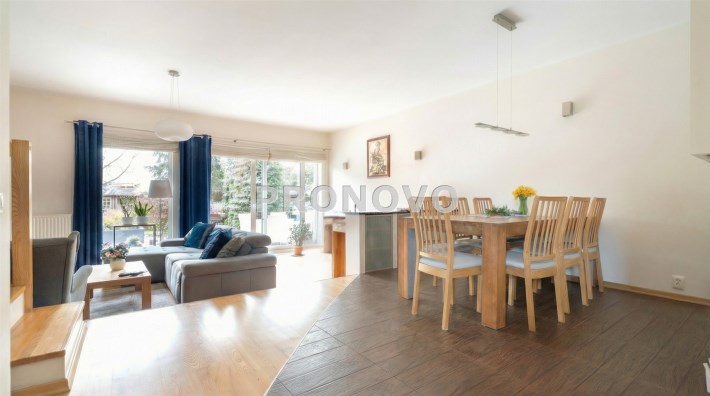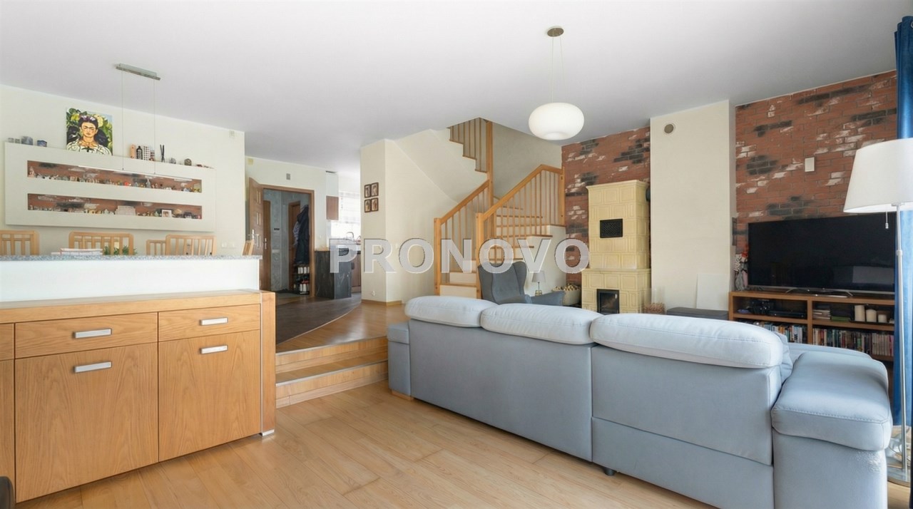 Parter to duży salon z otwartą kuchnia, podzielony na dwie strefy. Strefę kuchenno -jadalnianą i wypoczynkową. Kuchnia z oknem w jasnej zabudowie , w jadalni duży stół z krzesłami.  Strefa wypoczynkowa z panoramicznymi przesuwnymi oknami skąd jest wyjście na duży taras i słoneczny ogród. W salonie właściciele , zamiast kominka wstawili piec kaflowy. Na tym poziomie znajduje się pokój (gabinet ) o powierzchni ponad 12 m kw oraz toaleta. Tu też  znajdują się schody prowadzące na piętro pierwsze oraz na poziom -1.  Piętro pierwsze to trzy sypialnie, garderoba oraz łazienka z oknem i z dużym prysznicem Dzięki usytuowaniu okien, pokoje są dobrze  doświetlone a zarazem bardzo ustawne. W dwóch sypialniach balkony. Nad piętrem jest poddasze służące do przechowywania. Poziom -1 to duży garaż o powierzchni ponad 25 m oraz dwa dodatkowe pomieszczenia spełniające funkcje pralni i piwnicy.