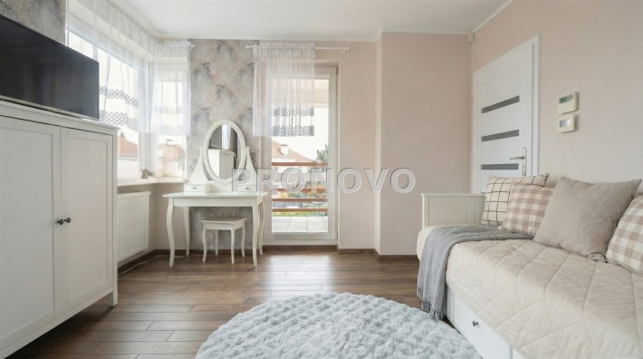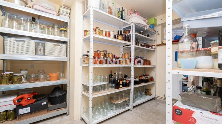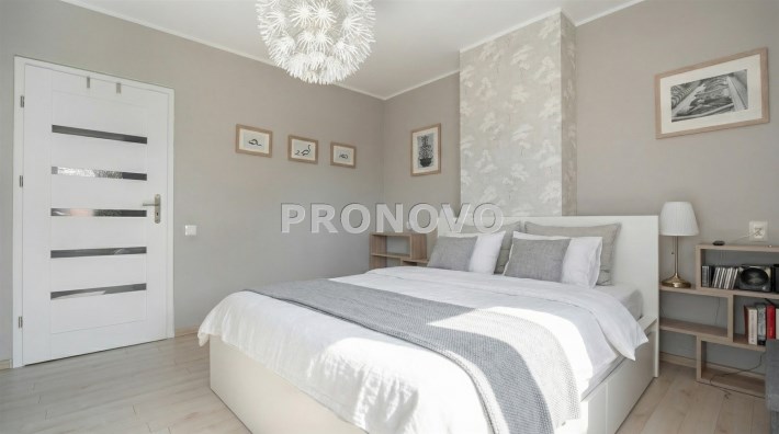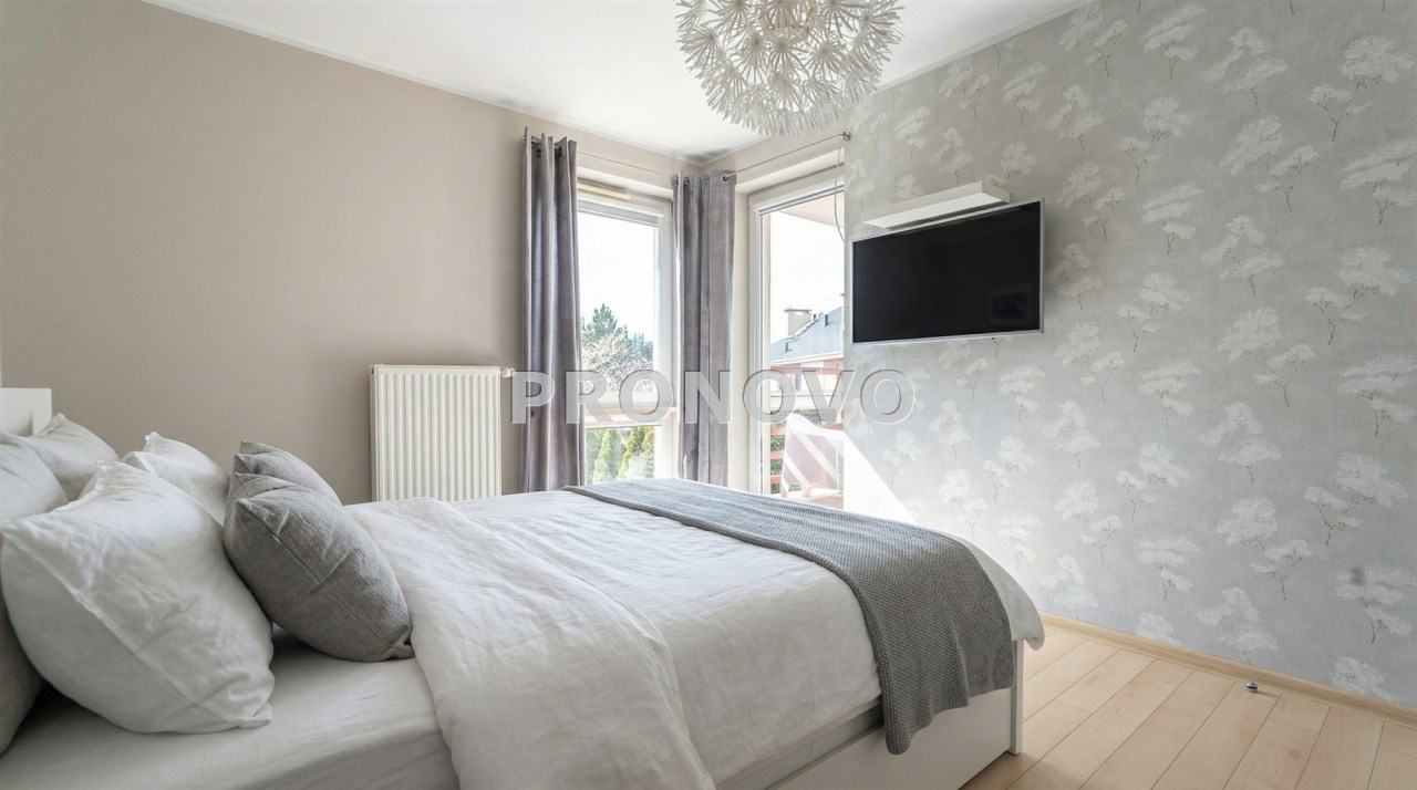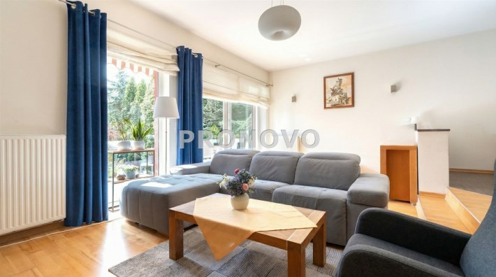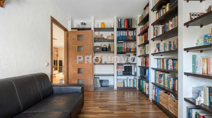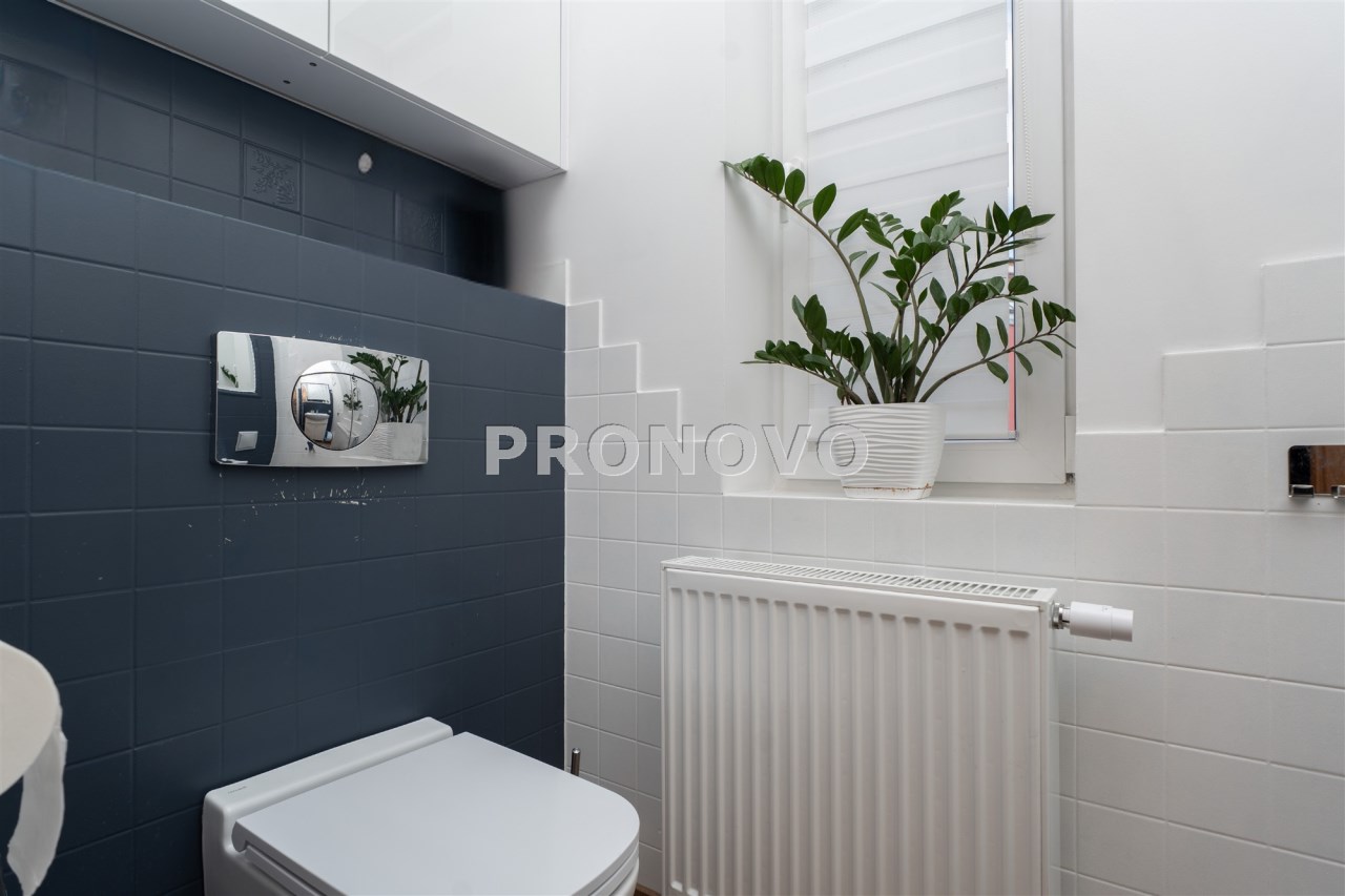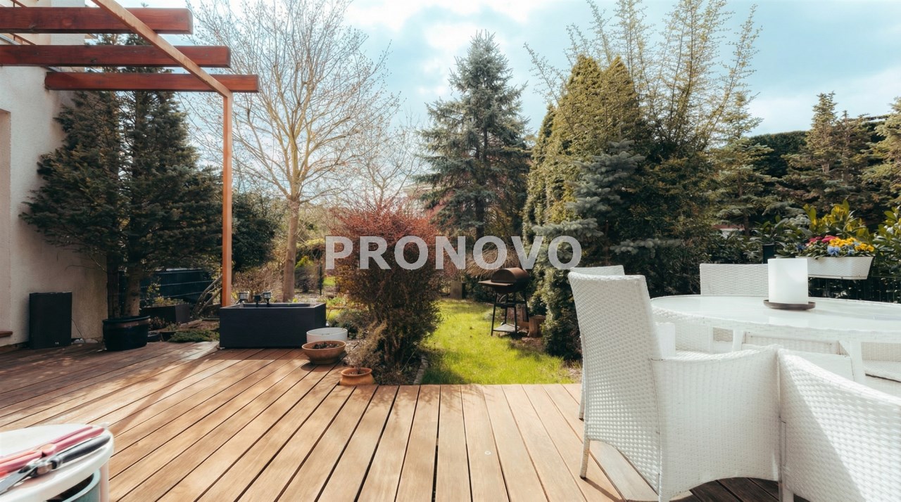 Parter to duży salon z otwartą kuchnia, podzielony na dwie strefy. Strefę kuchenno -jadalnianą i wypoczynkową. Kuchnia z oknem w jasnej zabudowie , w jadalni duży stół z krzesłami.  Strefa wypoczynkowa z panoramicznymi przesuwnymi oknami skąd jest wyjście na duży taras i słoneczny ogród. W salonie właściciele , zamiast kominka wstawili piec kaflowy. Na tym poziomie znajduje się pokój (gabinet ) o powierzchni ponad 12 m kw oraz toaleta. Tu też  znajdują się schody prowadzące na piętro pierwsze oraz na poziom -1.  Piętro pierwsze to trzy sypialnie, garderoba oraz łazienka z oknem i z dużym prysznicem Dzięki usytuowaniu okien, pokoje są dobrze  doświetlone a zarazem bardzo ustawne. W dwóch sypialniach balkony. Nad piętrem jest poddasze służące do przechowywania. Poziom -1 to duży garaż o powierzchni ponad 25 m oraz dwa dodatkowe pomieszczenia spełniające funkcje pralni i piwnicy.