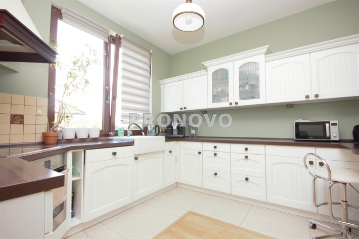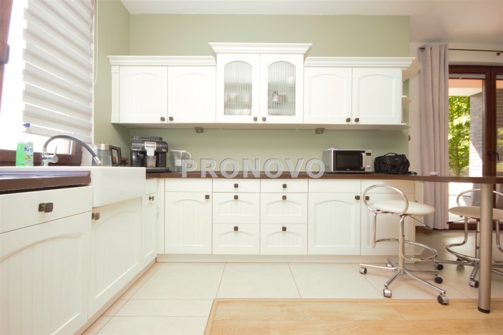 Na oknach w parterze rolety elektryczne. Kuchnia umeblowana i wyposażona  w sprzęt AGD -nowa zmywarka .Na podłogach panele. ściany gładzie.