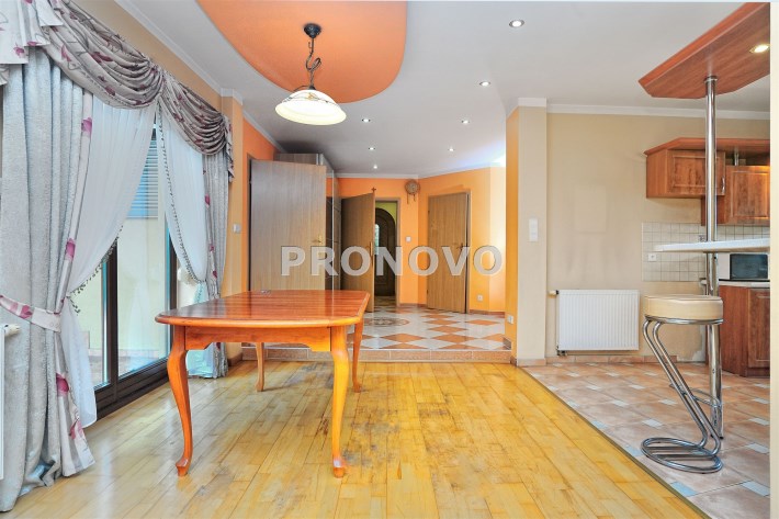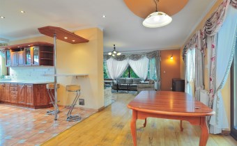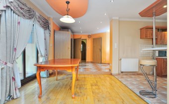 jasny salon połączony z kuchnią i jadalnią, z wyjściem na zadaszony taras oraz do ogrodu,