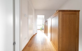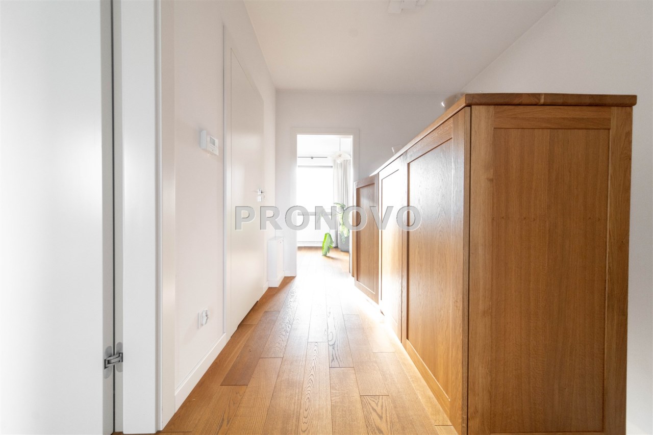 podłogi z drewna dębowego, drewniane drzwi oraz zabudowy stolarskie.