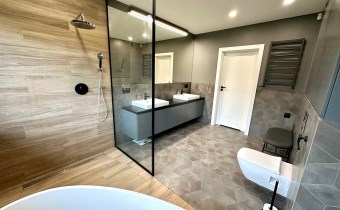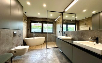 Wyposażenie łazienki natrysk, lustro, kabina prysznicowa, zabudowa łazienkowa, wanna/kabina prysznicowa, wanna narożna, wanna i prysznic, umywalka na szafce, umywalka, szafki, ogrzewanie podłogowe, natrysk z hydromasażem, dwie umywalki