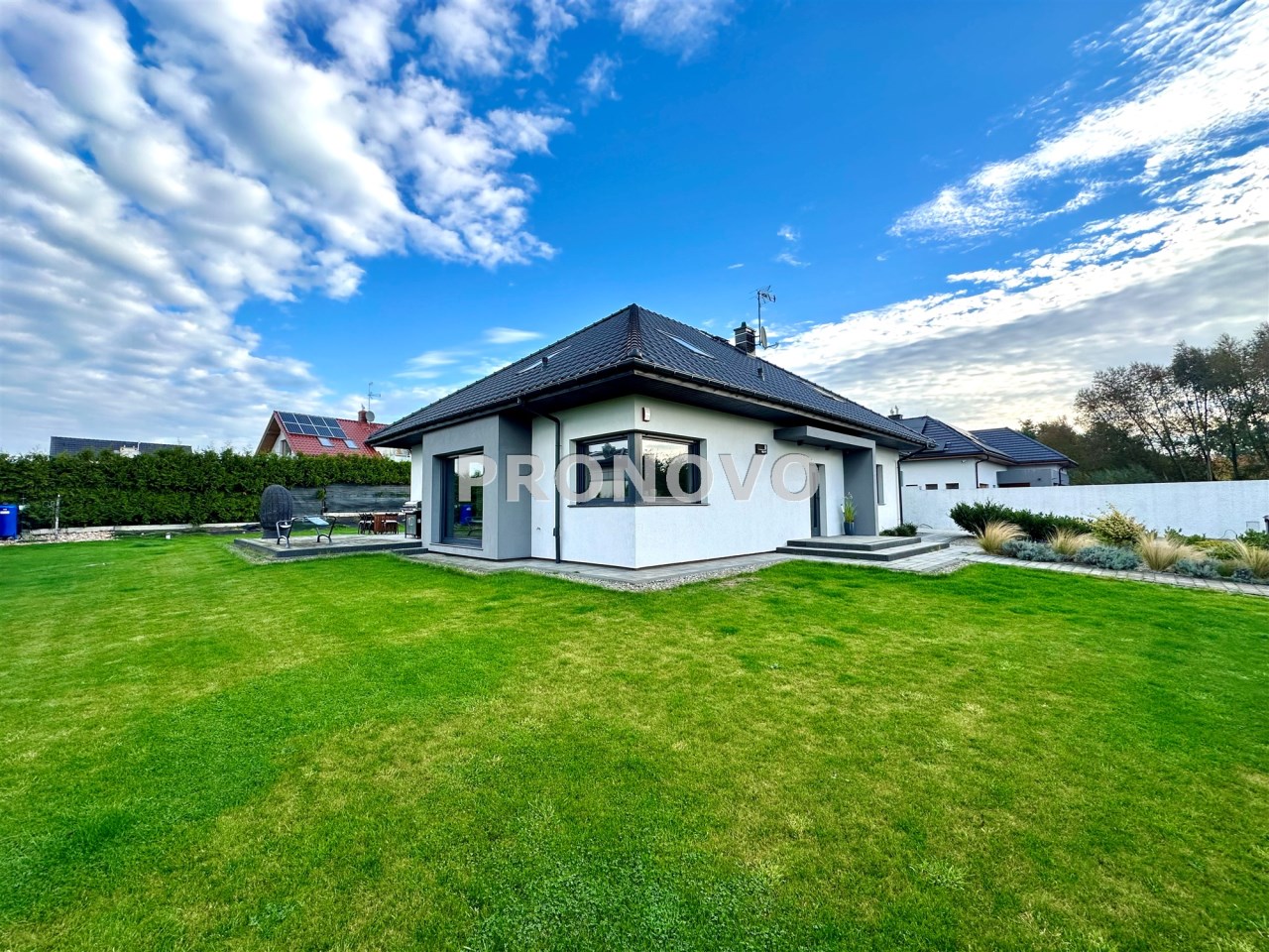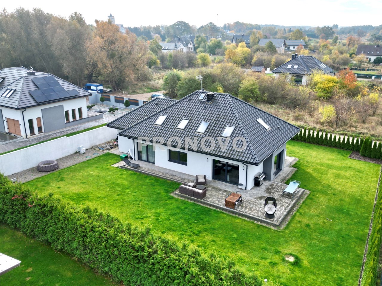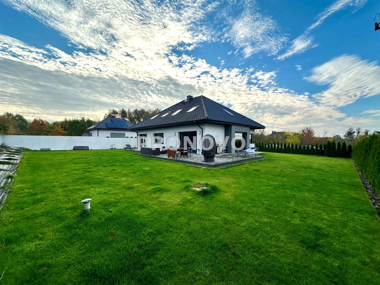 Ogród - zagospodarowany (wykonana dodatkowa studnia głębinowa do podlewania ogrodu), połączona z systemem nawadniającym (linie kroplujące oraz zraszacze firmy Rain Bird). Duży narożny wybrukowany taras ok. 70m2.