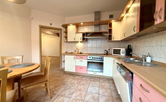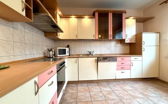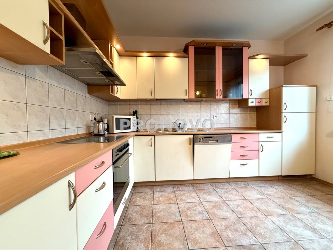 - kuchnia (13,5 m²) – w pełni umeblowana i wyposażona w sprzęt AGD (lodówka, zmywarka, piekarnik, płyta, okap),