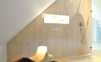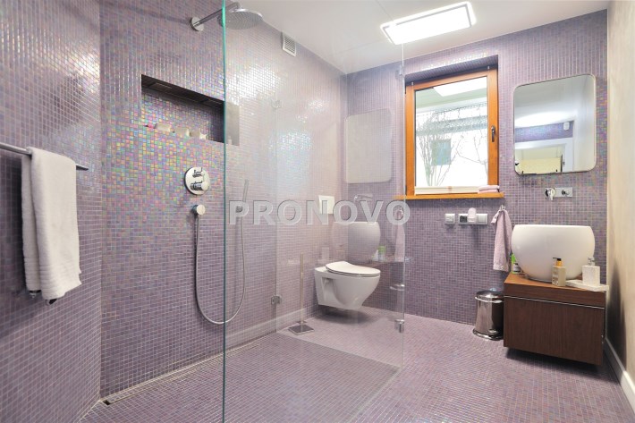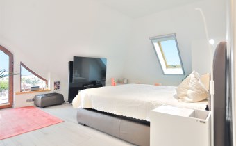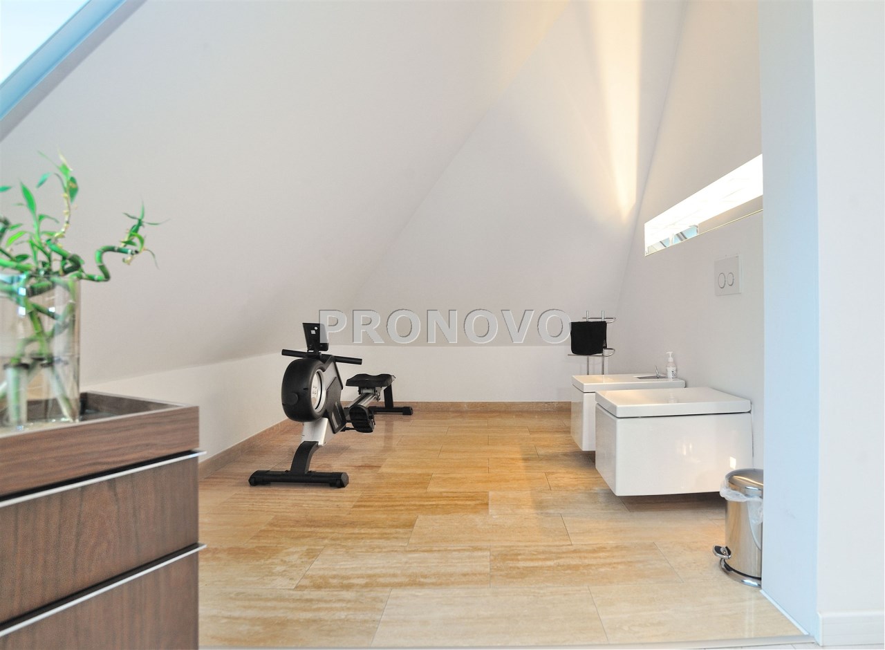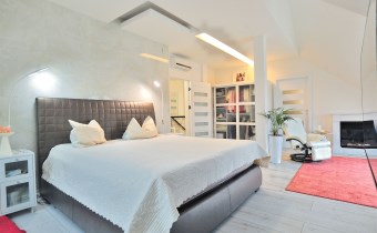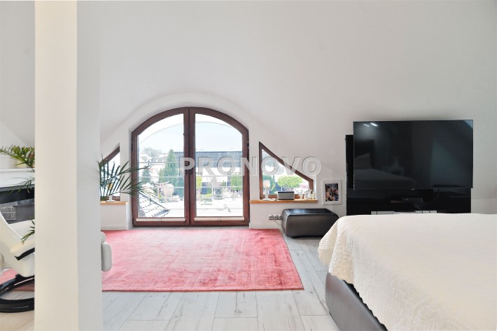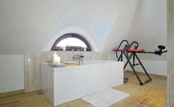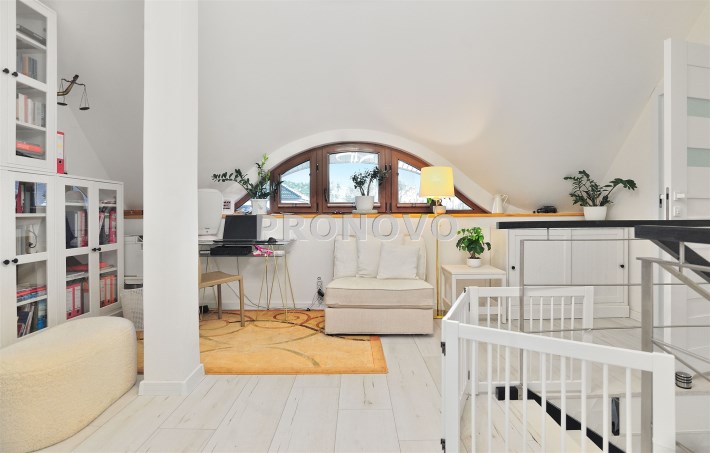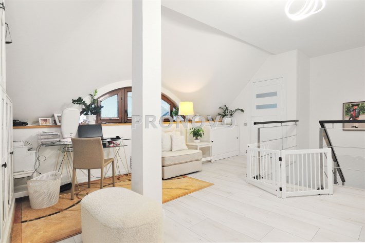 Pietro: sypialnia z oknem na ogród i garderobą, pokoj, zagospodarowany hol w z biblioteką i drugim biurem, oraz pokój kąpielowy.