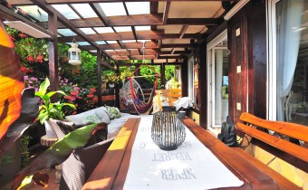 Jest pięknie zagospodarowana licznymi nasadzeniami, murowanym domkiem ogrodnika, wiatą, miejscem do grillowania i relaksu na świeżym powietrzu. To idealne miejsce na letnie przyjęcia i rodzinne spotkania.