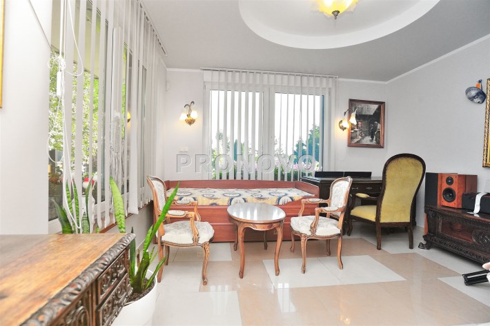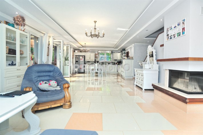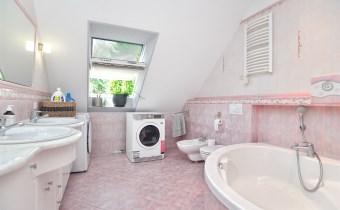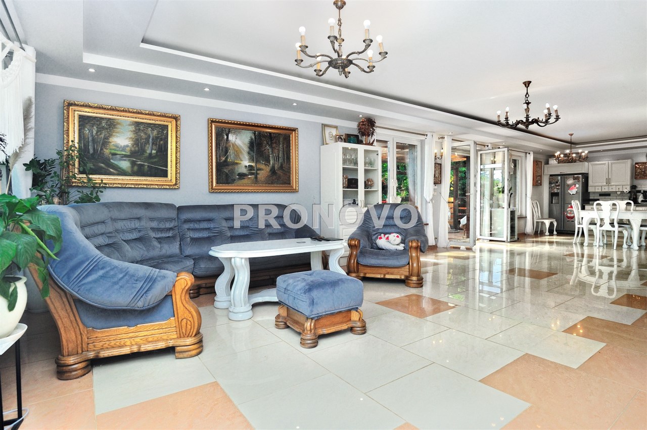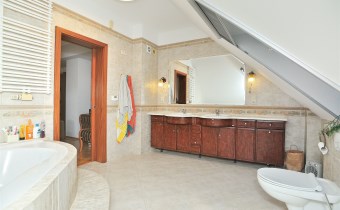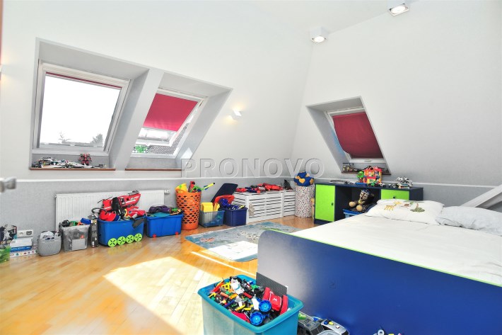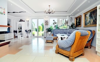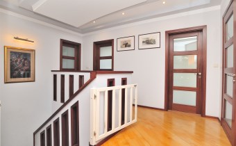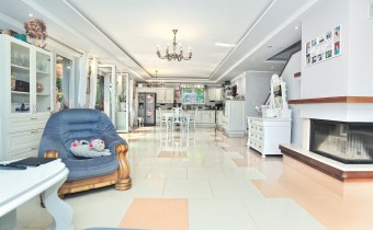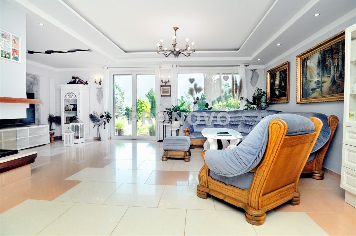 Na parterze znajduje się przestronny 80 m2 salon z kominkiem, połączony z jadalnią i w pełni wyposażoną kuchnią, spiżarnią, gabinet i garaż dwu stanowiskowy.