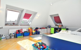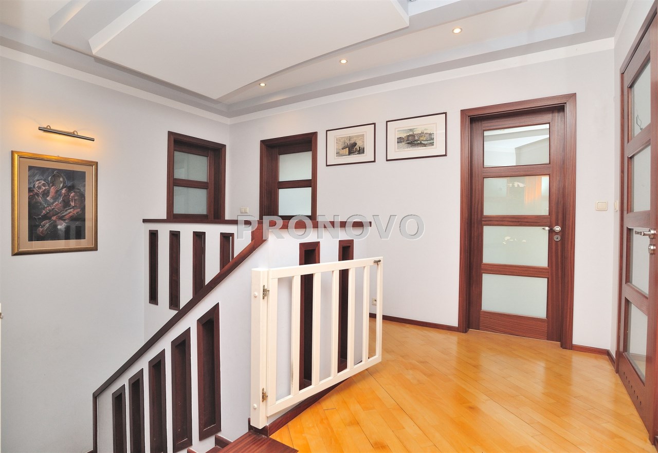 Na piętrze znajduje się pięć sypialni, w tym główna sypialnia z własną łazienką i garderobą, oraz dodatkowa łazienka.