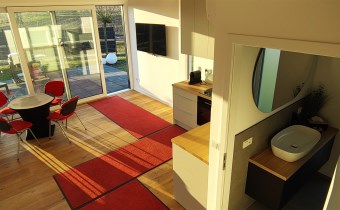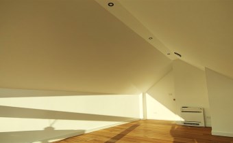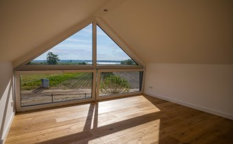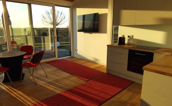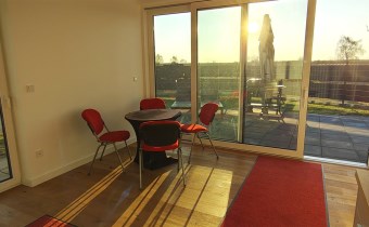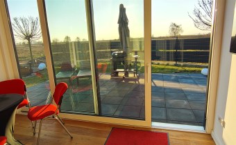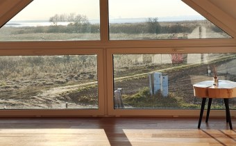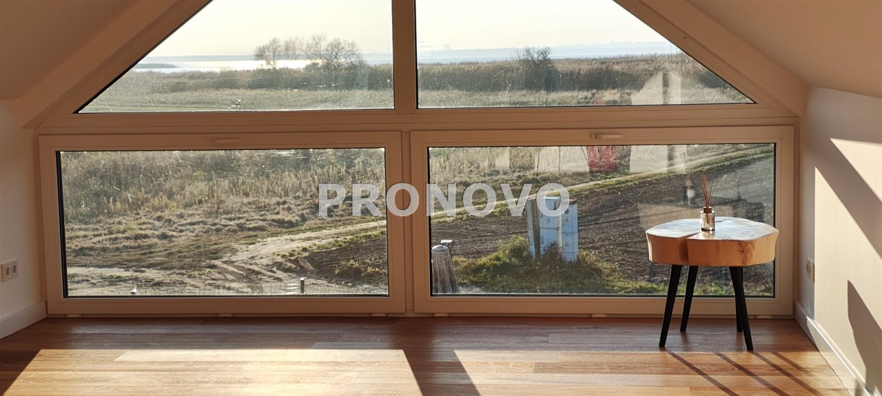 Salon o powierzchni 25 m2 z wyjściem na taras, pokój na piętrze 25 m2  z widokiem na Zalew Szczeciński.
