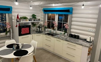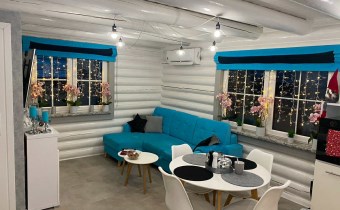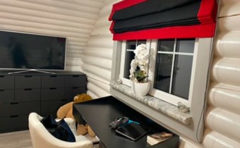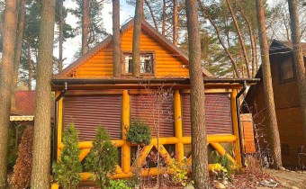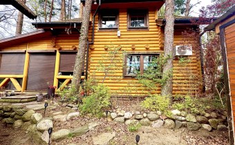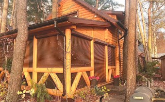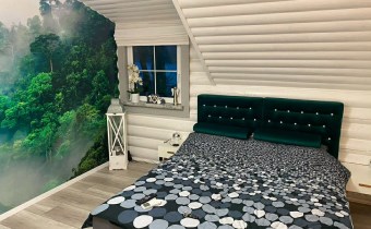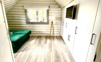 Dom wykonany z naturalnego bala drewnianego tworzy niepowtarzalny klimat – ciepły, przytulny i harmonijnie wpisujący się w otoczenie lasów i jeziora. Duże przeszklenia zapewniają doskonałe doświetlenie wnętrza i widok na zieleń.