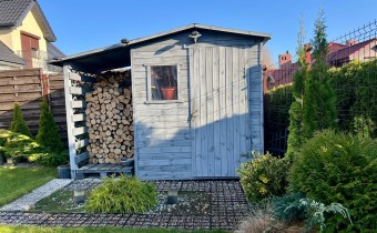 Na działce znajdują się liczne nasadzenia oraz praktyczny domek narzędziowy.