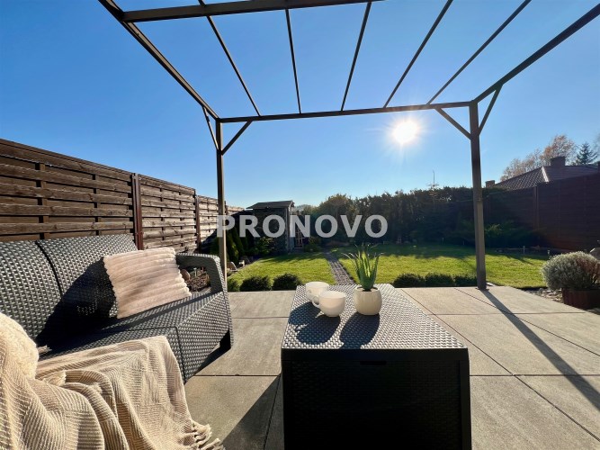 •    od strony ogrodu – drewniana pergola i ogrodzenie z siatki.