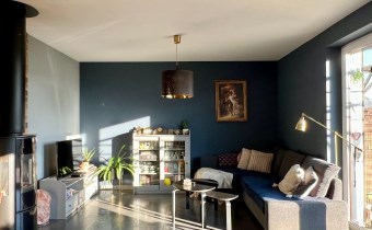Salon jest od strony południowej – słoneczny i  utrzymany w nastrojowej, stonowanej kolorystyce, która nadaje wnętrzu elegancji i przytulności