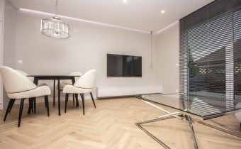 - duży salon z aneksem kuchennym z wyjściem na taras i ogród