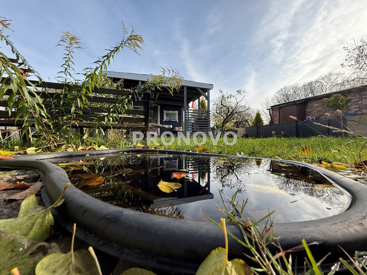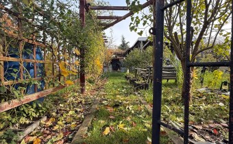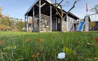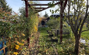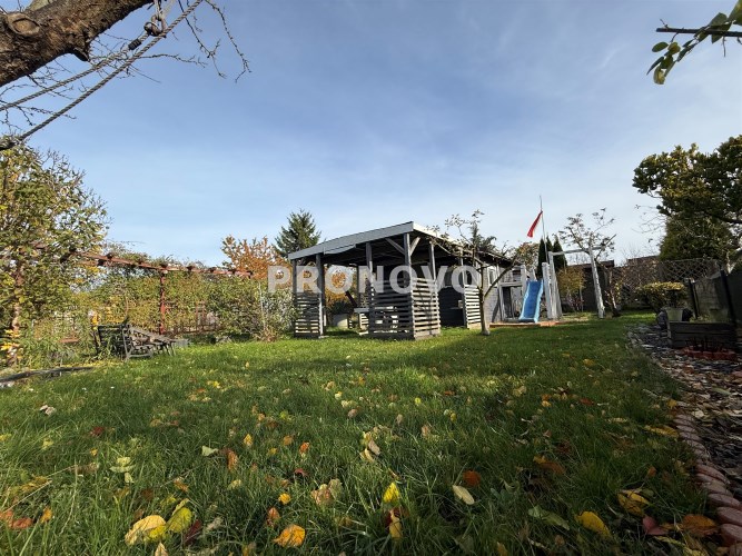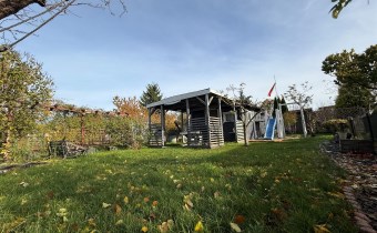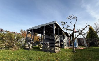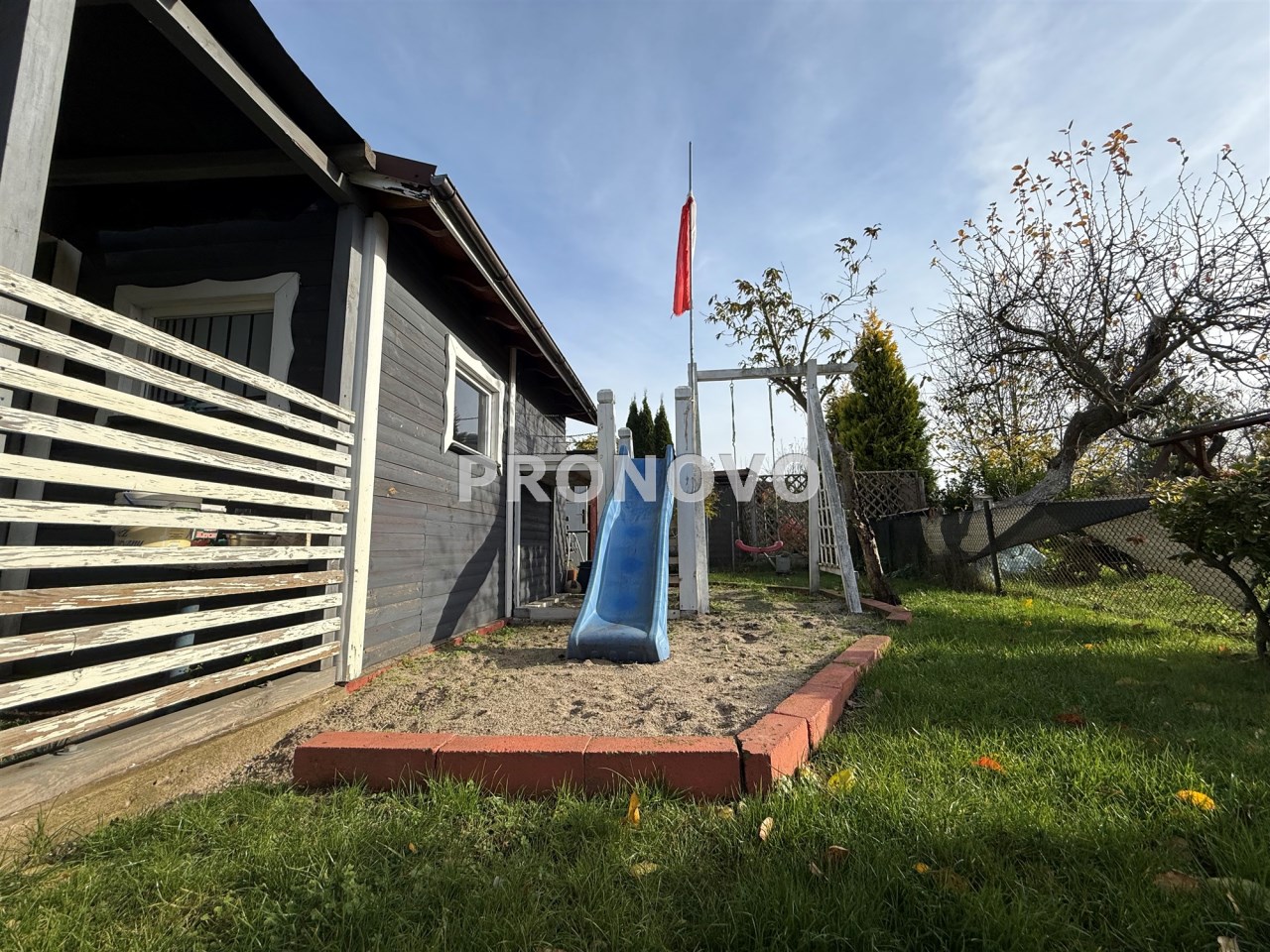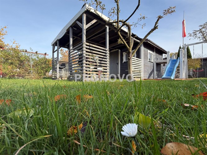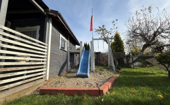 - druga część działki pełni funkcję rekreacyjną – znajduje się tu drewniana altanka wykonana z należytą starannością, plac zabaw dla dzieci, toaleta, a także drzewa owocowe, krzewy i zadbany trawnik, które tworzą przyjemną przestrzeń do relaksu.