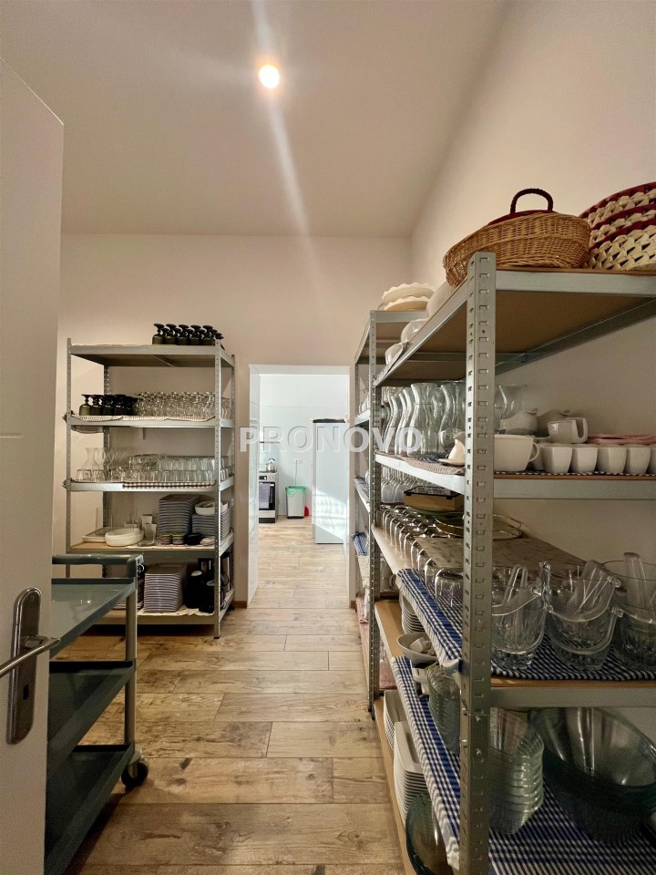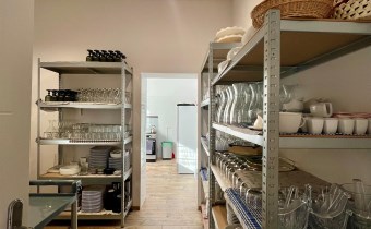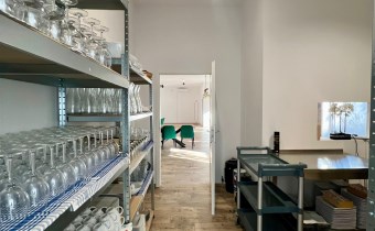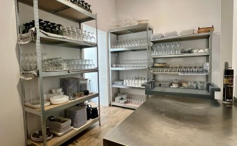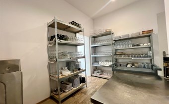 • Zaplecze wyposażone: zmywak, zmywarka, lodówka, mikrofala, kuchenka podręczna, stoły robocze,
