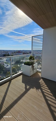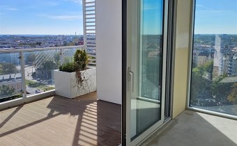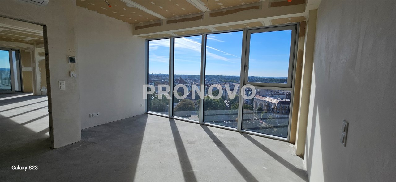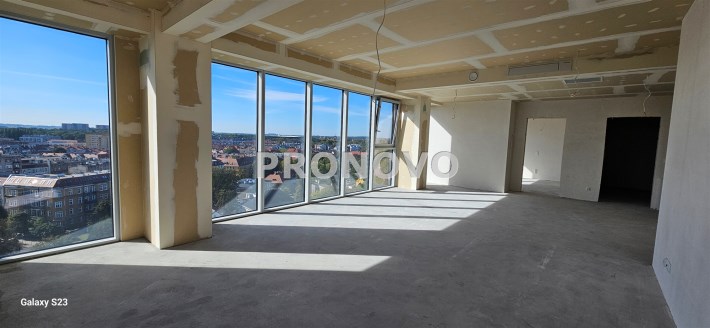Z przestronnego tarasu rozpościera się niezwykły widok na panoramę miasta. Wnętrze apartamentu jest funkcjonalne, komfortowe i jasne, a dzięki panoramicznym przeszkleniom pomieszczenia są doskonale doświetlone.