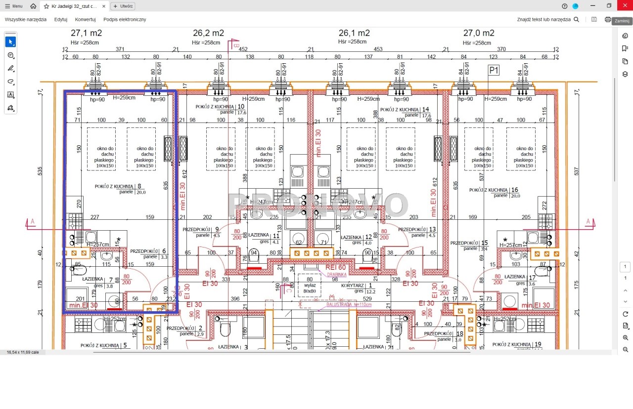Mieszkanie o jednostronnej, zachodniej ekspozycji okien. Powierzchnia użytkowa wg. dokumentacji projektowej to 27,10 m2.