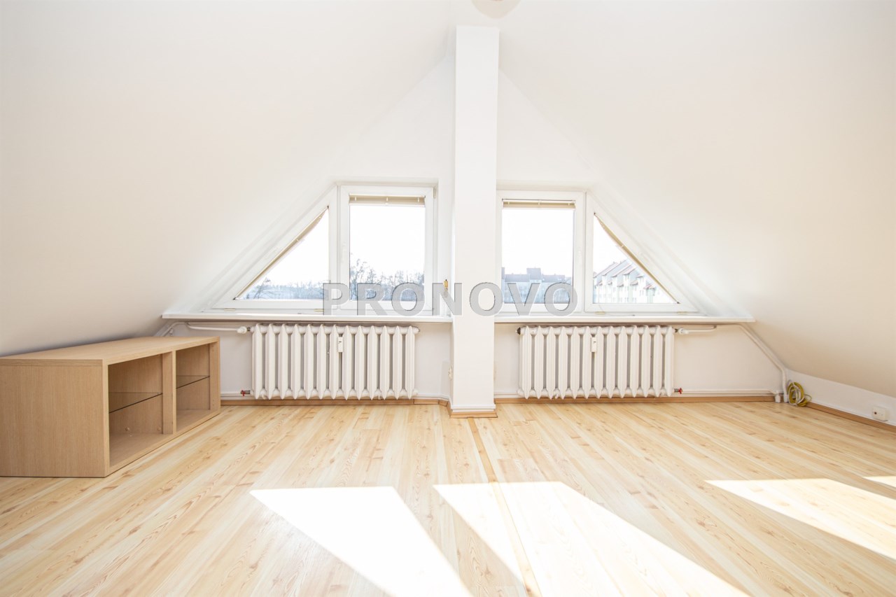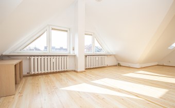 świeżo wymienione okna połaciowe, budynek po remoncie dachu z zadbaną klatką schodową.
