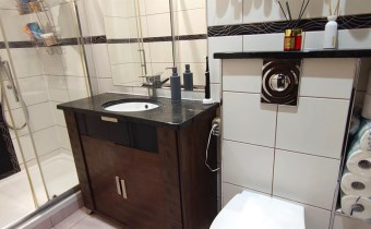Łazienka wyposażona w natryskową kabinę, umywalkę, wc, grzejnik drabinkowy, Na podłodze płytki.