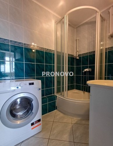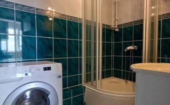• łazienka z kabiną prysznicową i pralką,