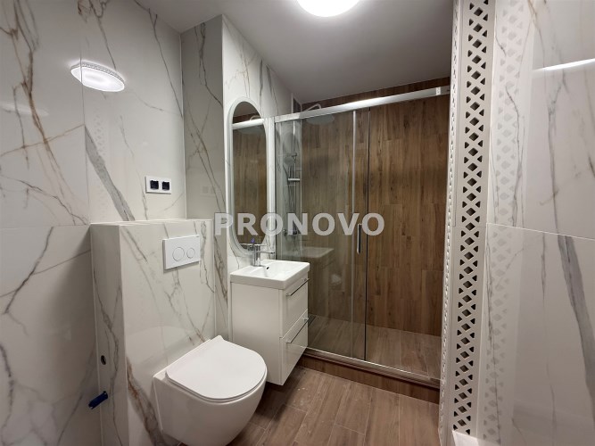 łazienka po remoncie, wyposażona w kabinę prysznicową