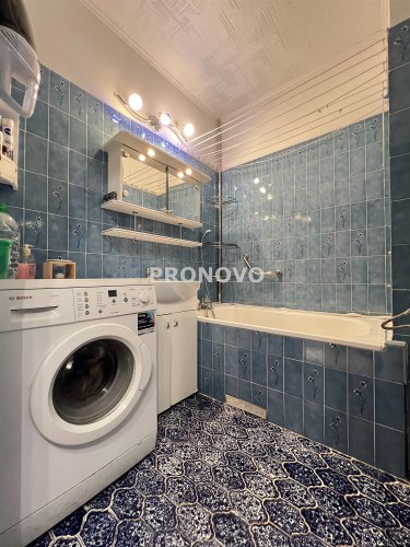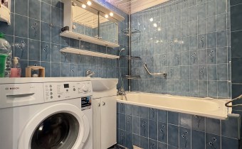-łazienka wyposażona w wc, umywalkę, wannę oraz pralkę.