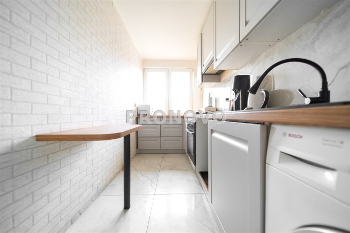 Na podłodze panele, nowe okna PCV z roletami. Gładzone ściany. Kuchnia w zabudowie z przedłużonym blatem pod oknem wyposażona w lodówkę, zamrażarkę, piekarnik oraz płytę indukcyjną. Łazienka z wanną w płytkach. Duży, widny i ustawny salon. Przestronna sypialnia pełniąca w tej chwili pokój dziecka.