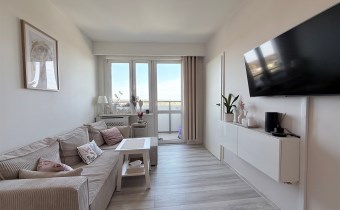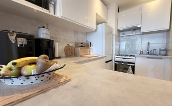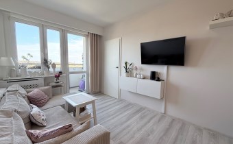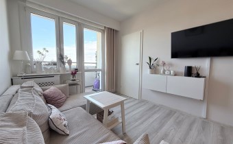 • jasnego salonu z aneksem kuchennym oraz wyjściem na balkon,