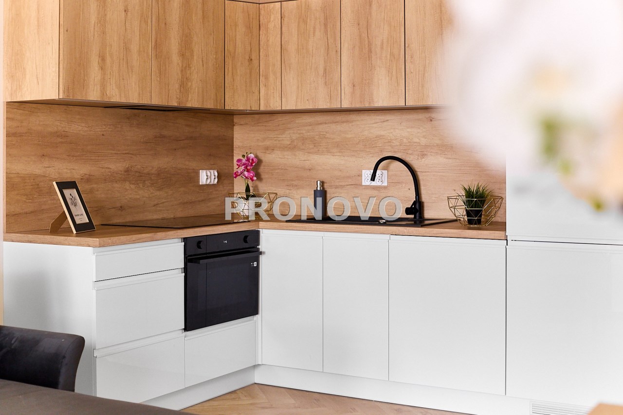Wnętrze zostało urządzone z dużą starannością, przy użyciu materiałów wysokiej jakości. Styl minimalistyczny, naturalna kolorystyka i funkcjonalne rozwiązania tworzą harmonijną, przyjazną przestrzeń.