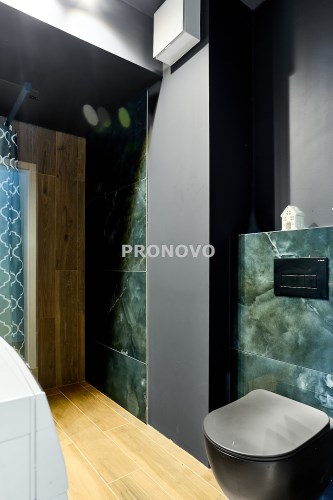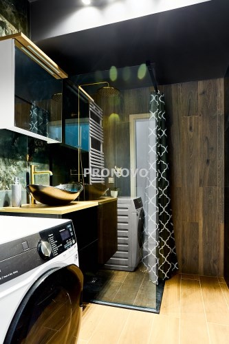 • Stylową łazienkę z przeszkloną kabiną prysznicową