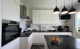 Kuchnia została zaprojektowana w nowoczesnym stylu i wyposażona w sprzęt AGD w zabudowie, m.in. zmywarkę, płytę gazową oraz piekarnik.