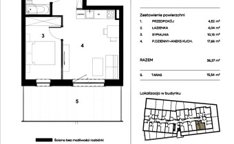 Mieszkanie znajduje się na I piętrze niskiego bloku mieszkalnego z widną. Powierzchnia użytkowa 36,37m2 + przestronny taras 15,54m2, dodatkowo do mieszkania przynależy prywatne zewnętrzne miejsce parkingowe ( w dodatkowej cenie 25.000 pln).