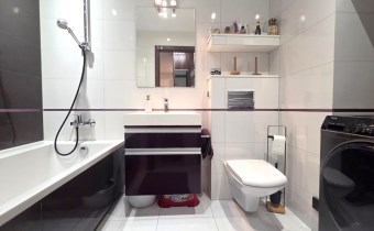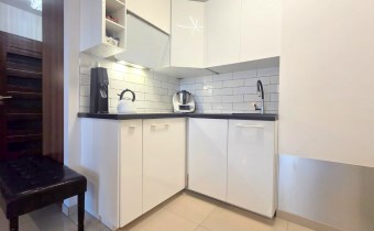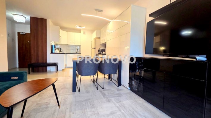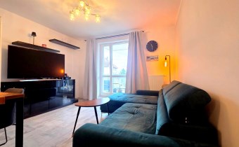 Składa się z przestronnego salonu, w którym oprócz wygodnego narożnika znajduje się pełnowymiarowe łóżko chowane w eleganckiej zabudowie meblowej w połysku – praktyczne rozwiązanie, które pozwala zachować przestrzeń i estetykę wnętrza. Kuchnia jest osobna, w pełni wyposażona i gotowa do użytku, natomiast w łazience znajduje się wanna oraz pralka. W przedpokoju umieszczono dużą szafę w zabudowie, co dodatkowo zwiększa funkcjonalność mieszkania.