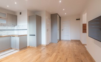 Mieszkanie zaaranżowane w nowoczesnym stylu - salon otwarty na przedpokój, połączony z aneksem kuchennym, duża sypialnia z balkonem i mały pokój. Łazienka połączona z wc. Ekspozycja okien południowo zachodnia (salon z aneksem i mały pokój od strony południowej, duża sypialnia z balkonem od strony zachodniej).