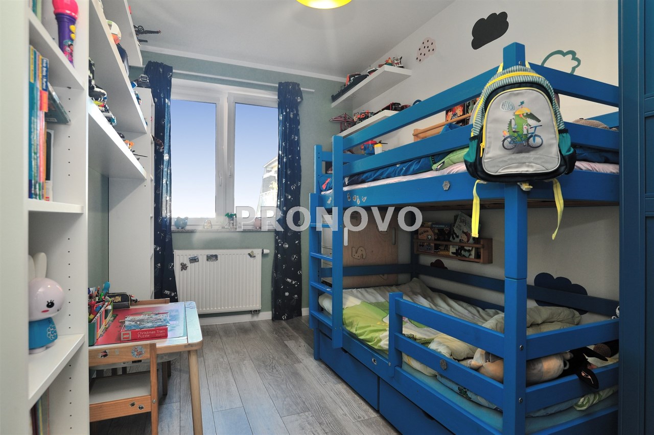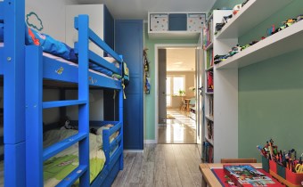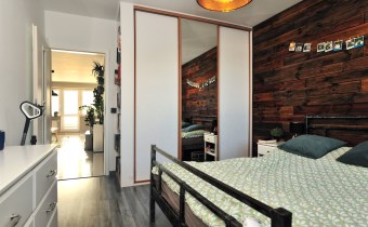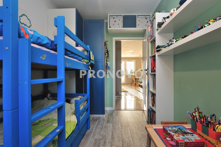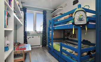 • Dwa pokoje (13,6 m² i 9,6 m²) - zlokalizowane z północnej części mieszkania, w pierwszym z pokojów znajduje się duża szafa zrobiona na wymiar wraz z małą biblioteczką na książki. W pokoju dziecięcym natomiast znajduje się szafa narożna PAX z Ikei. Wejście do pokoi bezpośrednio z przedpokoju.