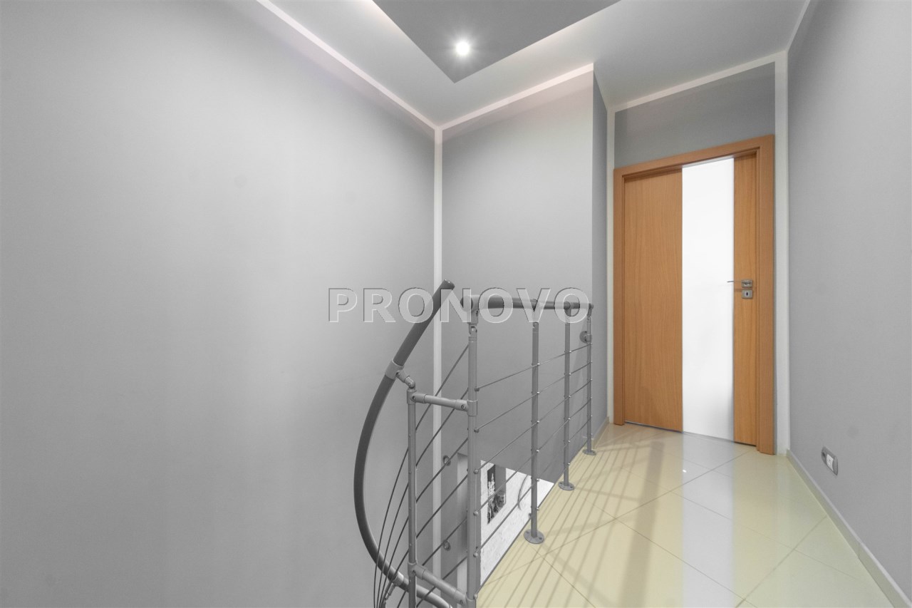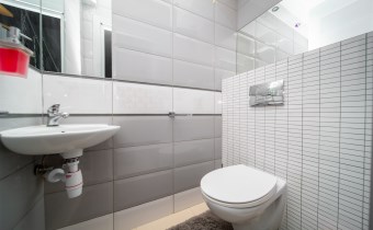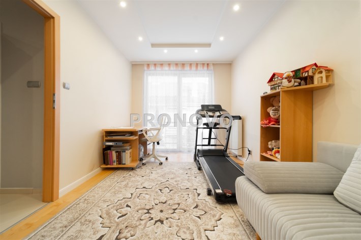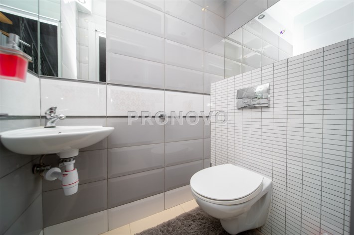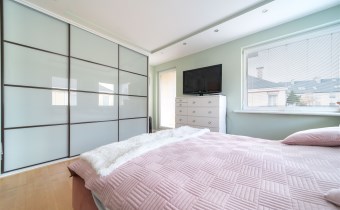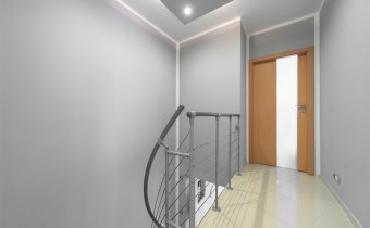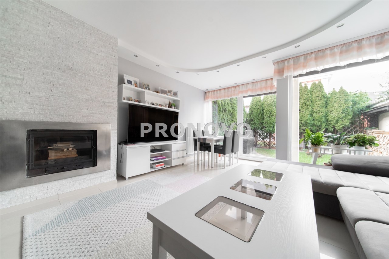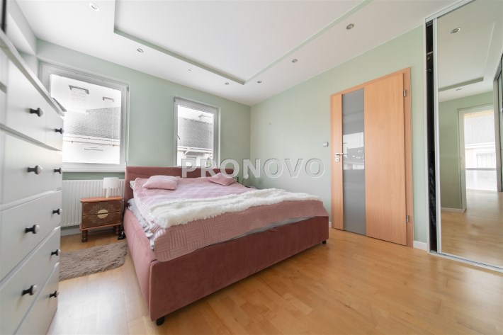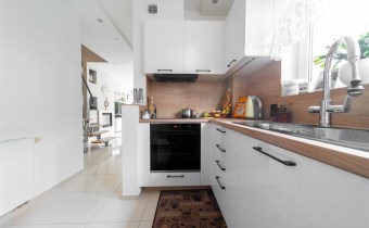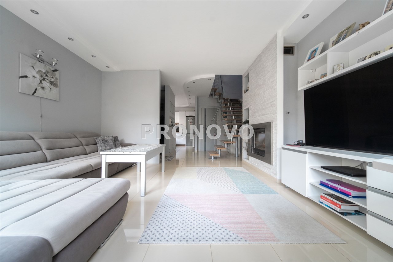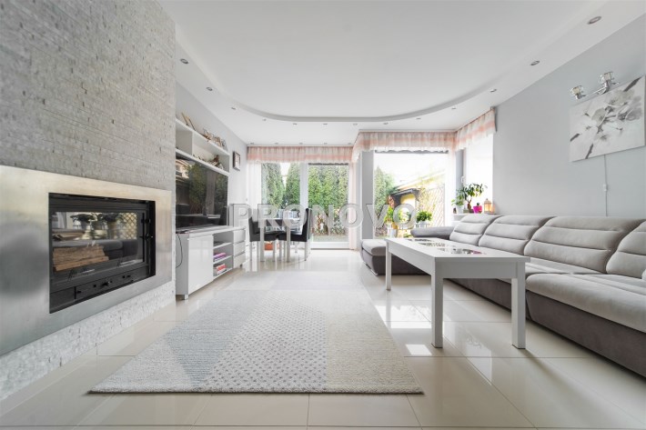 Kuchnia w nowoczesnej zabudowie, ze sprzętem AGD. Salon z kominkiem, jasny z ładnie zaprojektowanym oświetleniem. Na tym poziomie znajduje się również toaleta z umywalką. Z poziomu 0 schodami wchodzimy na 1 piętro o powierzchni 37 metrów. Znajdują się tam dwie duże sypialnie, każda z balkonem oraz duża łazienka/pokój kąpielowy z prysznicem i wanną.