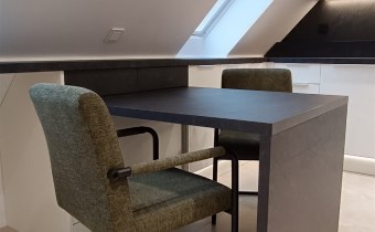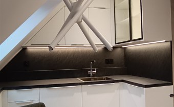 • kuchni z dwoma pięknymi drewnianymi oknami połaciowymi, które zapewniają dużo naturalnego światła i przyjemną atmosferę,