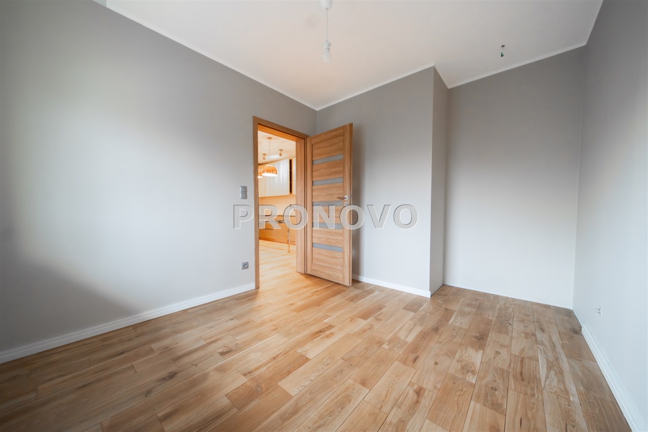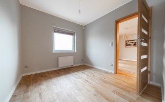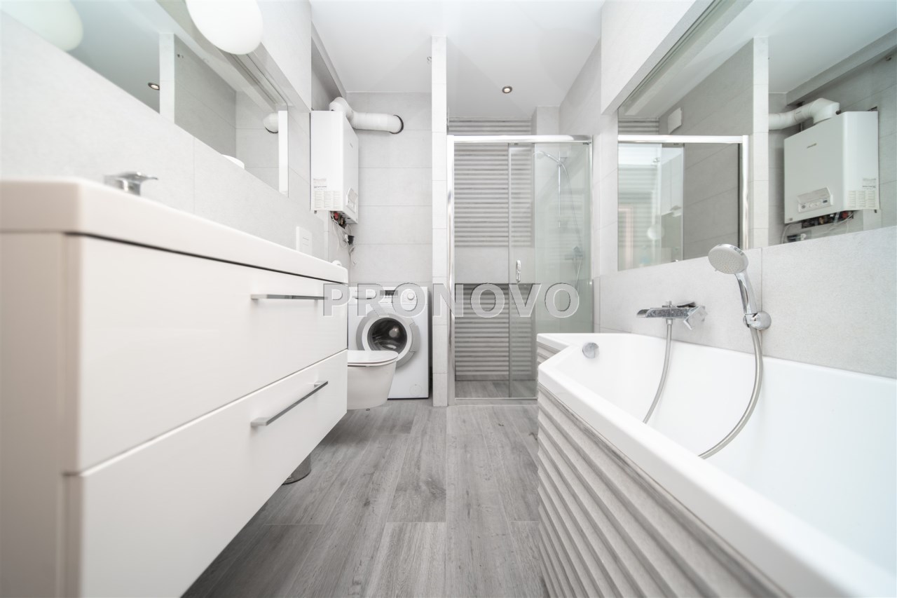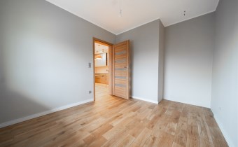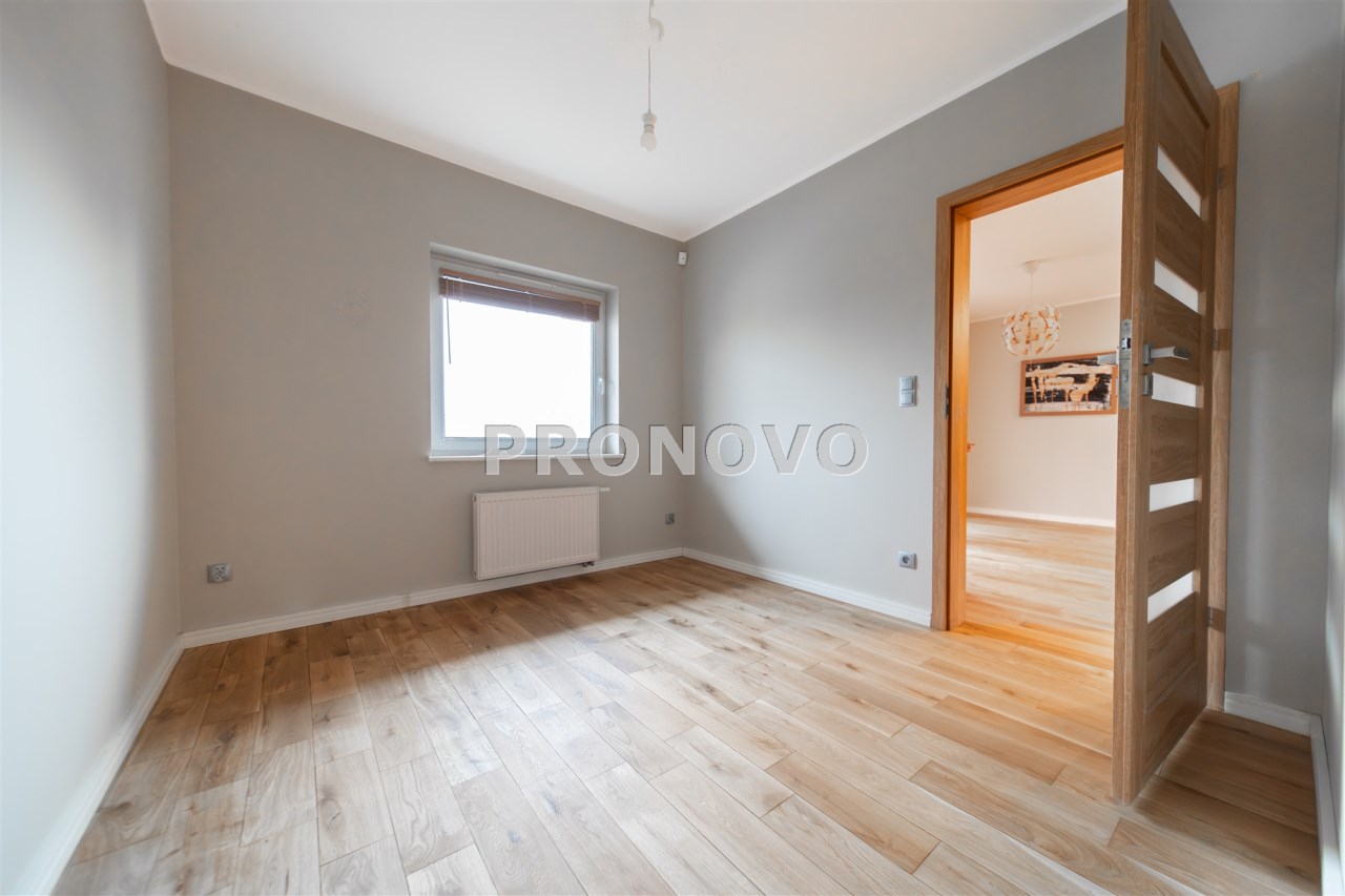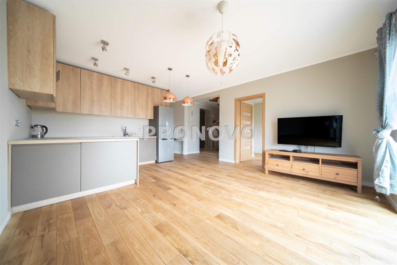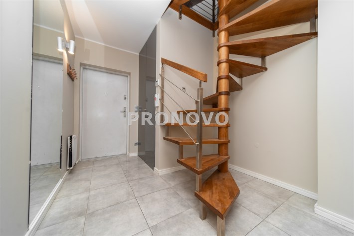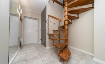 Mieszkanie wykończone w wysokim standardzie, z dbałością o detale i funkcjonalność. Dębowa podłoga oraz schody, nowoczesne oświetlenie, kuchnia wykonana na zamówienie, instalacja alarmowa. Zabudowy stałe – w przedpokoju oraz sypialni głównej – również robione na wymiar.