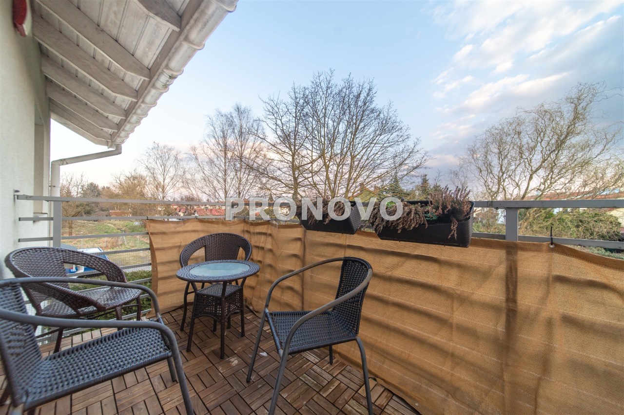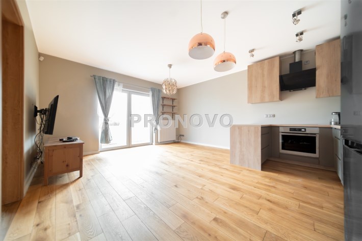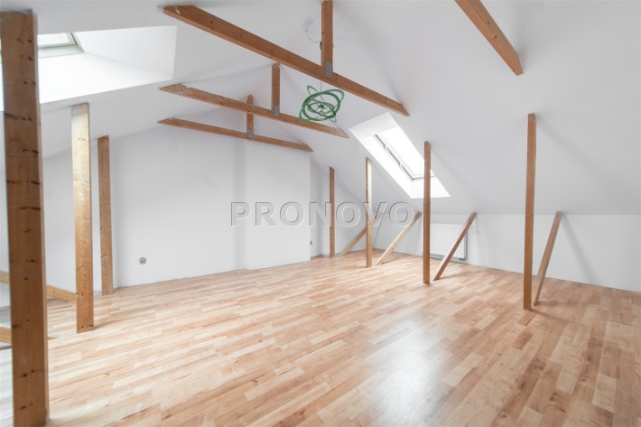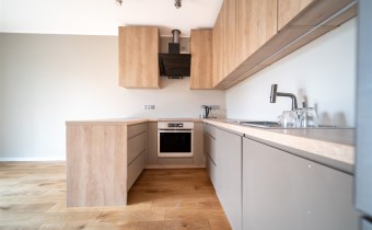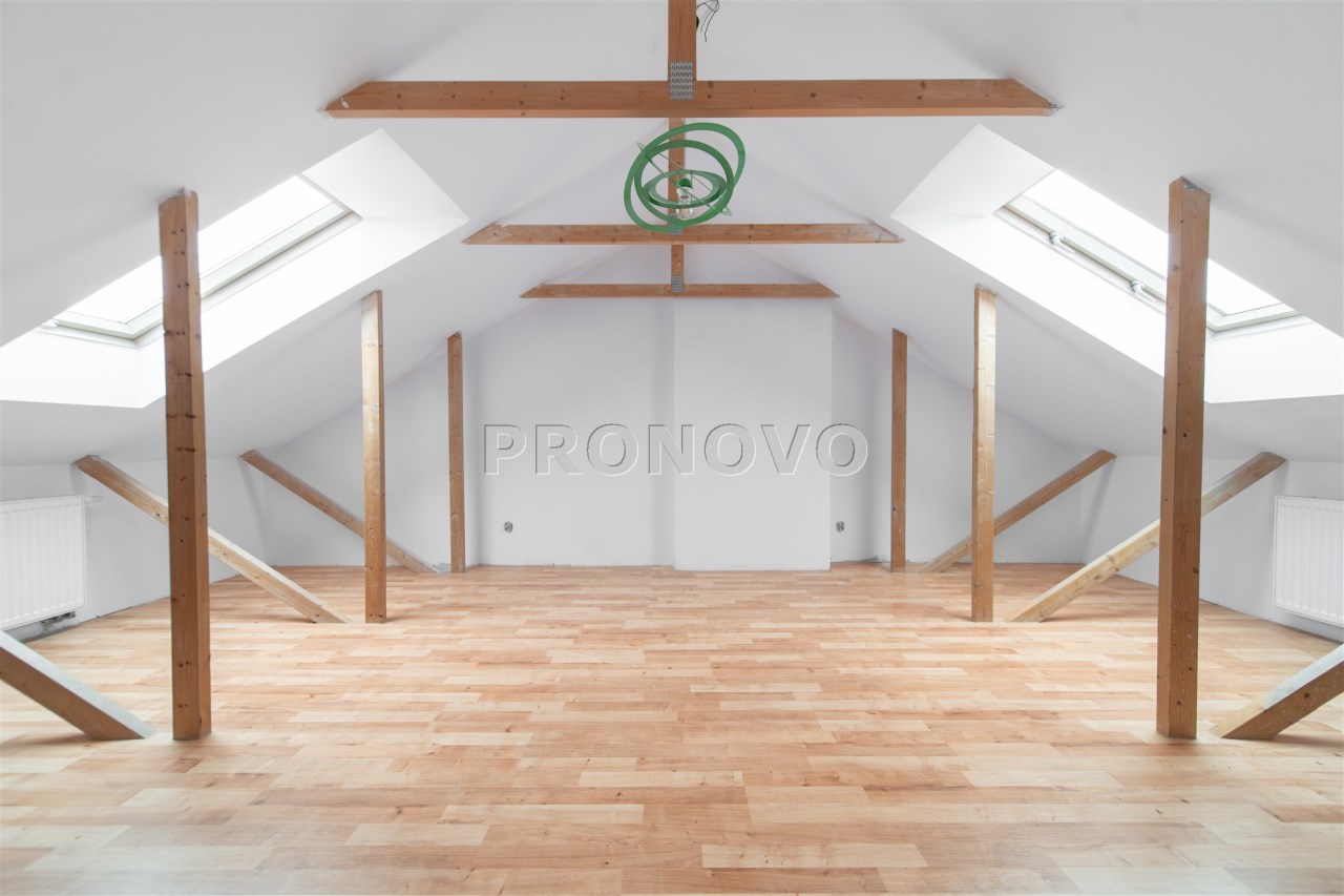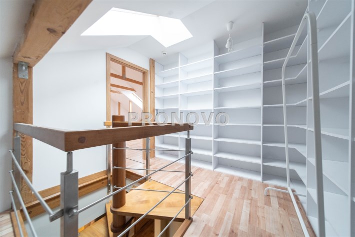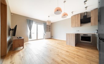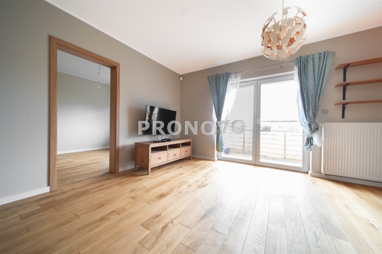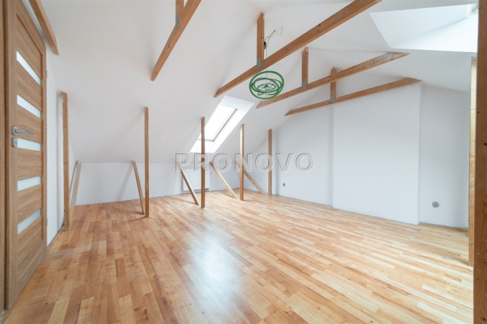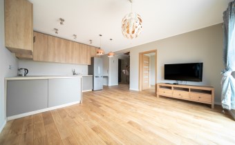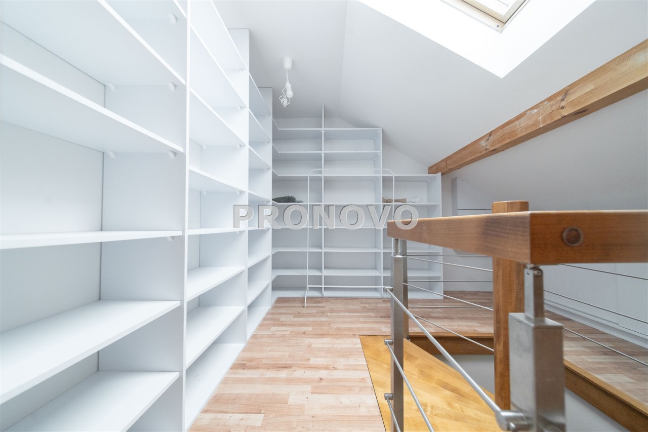 Mieszkanie wykończone w wysokim standardzie, z dbałością o detale i funkcjonalność. Dębowa podłoga oraz schody, nowoczesne oświetlenie, kuchnia wykonana na zamówienie, instalacja alarmowa. Zabudowy stałe – w przedpokoju oraz sypialni głównej – również robione na wymiar.