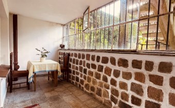 Pokój umeblowany z wyjściem na zabudowaną werandę z wyjściem do ogrodu.