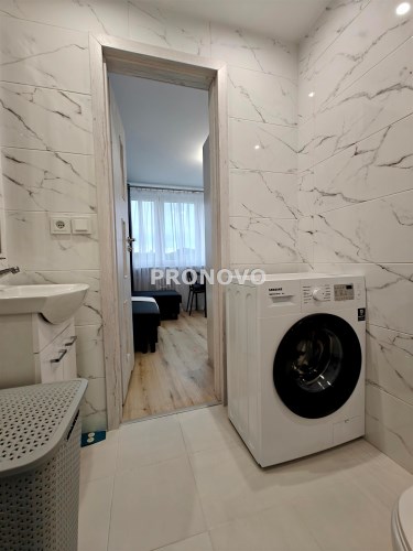Na wyposażeniu znajduje się: płyta indukcyjna, lodówka, pralka, rozkładany narożnik, szafa i komoda IKEA, stół i dwa krzesła – wszystkie sprzęty są nowe i nieużywane.