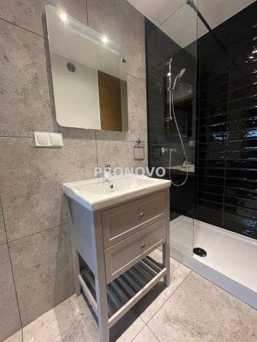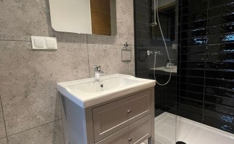 Jest duża szafa, szafka rtv, kanapa rozkładana z miejscem na pościel, kuchnia w zabudowie (płyta indukcyjna, piekarnik, zmywarka, pralka), w łazience dodatkowa szafka.