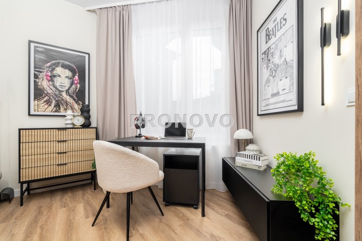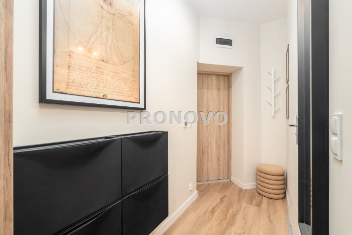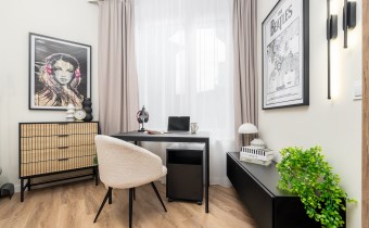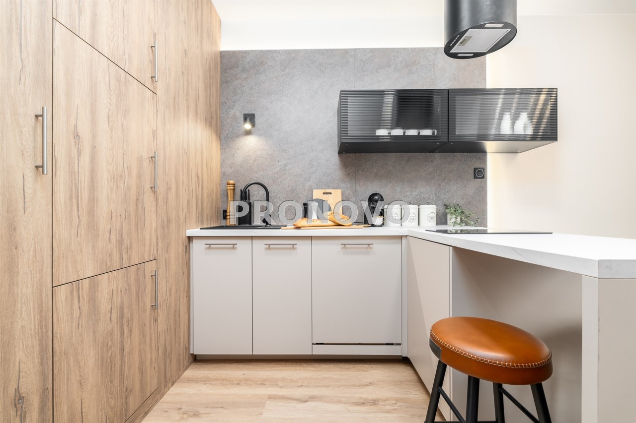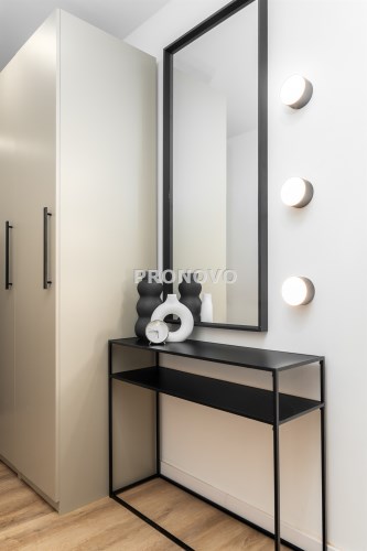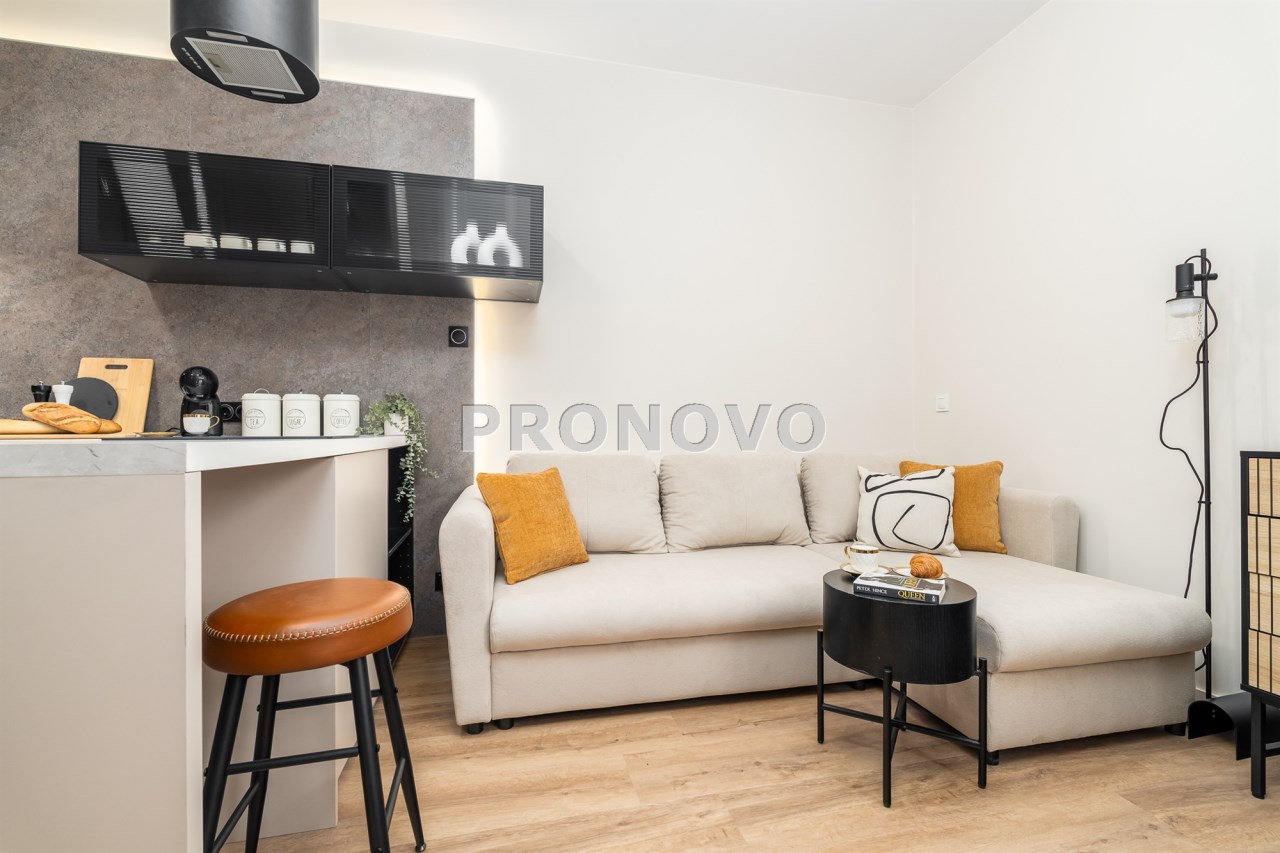Mieszkanie po remoncie kapitalnym, o południowej ekspozycji okien. Pokój dzienny z aneksem kuchennym, łazienka i korytarz. W pokoju i korytarzu na podłodze panele, ściany wygładzone, malowane. W pokoju wypoczynek, stolik kawowy, biurko, krzesło, komoda, stolik RTV, duża szafa ubraniowa i szafka na buty. Łazienka w glazurze i terakocie, kabina prysznicowa, muszla podwieszana typu geberit, umywalka, meble łazienkowe, lustro, pralka. Kuchnia kompletnie umeblowana i wyposażona: barek, dwa stołki barowe, duża lodówka z zamrażalnikiem, lodówka, płyta elektryczna, okap, zmywarka, mikrofala.